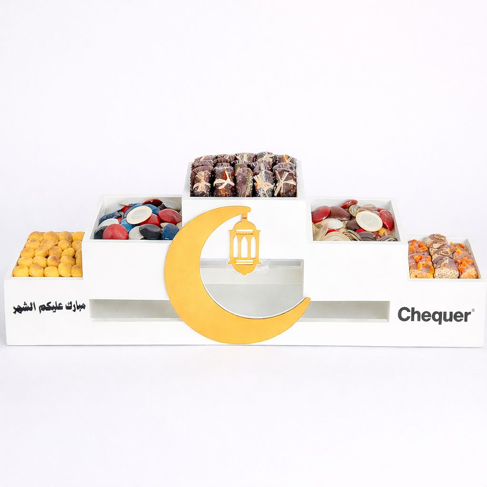 A tray that contains dipped dates stuffed with Arabic fillings: - Hazelnut. - Pistachio. - Dried fig. - Pecan. - Dried apricot with hazelnuts.