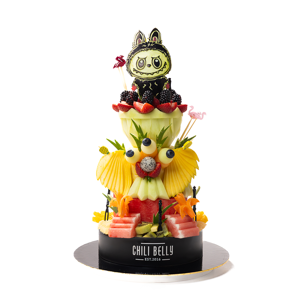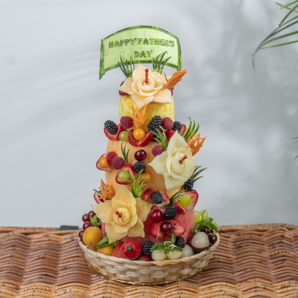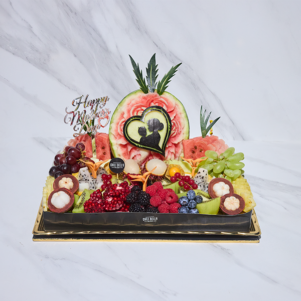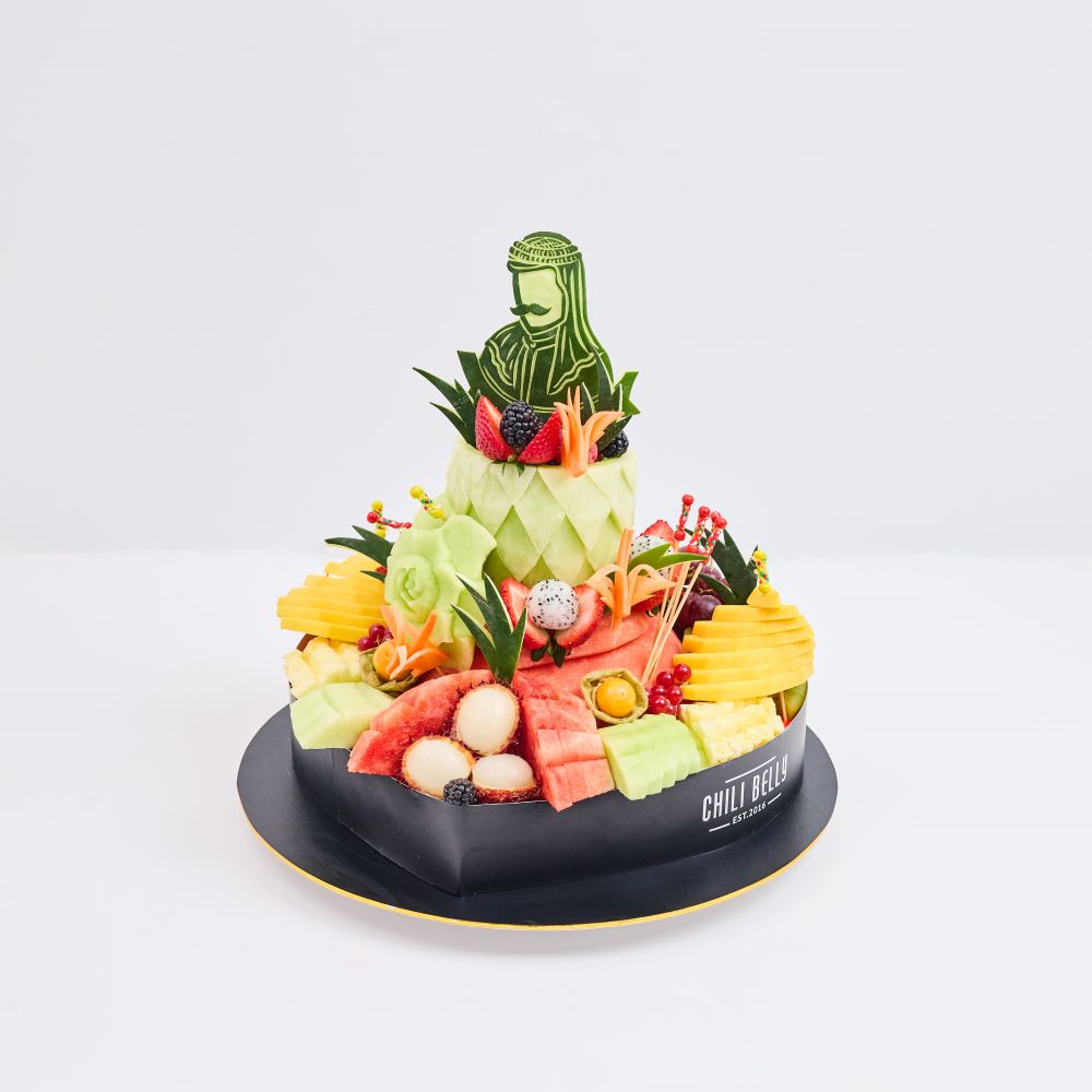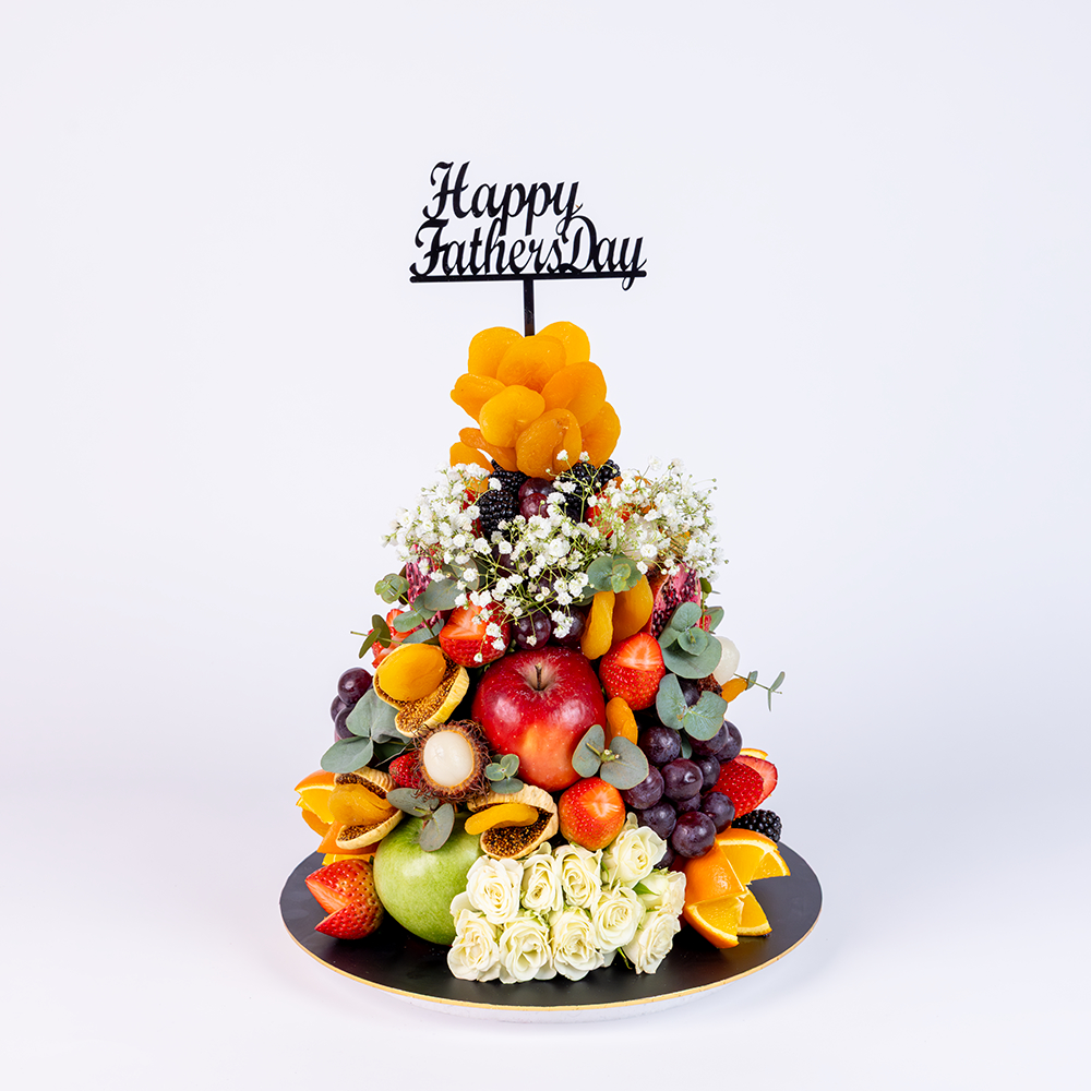 An arrangement featuring grapes, strawberry, rambutan, apple, orange, pomegranate, apricot, fig, and flowers.
