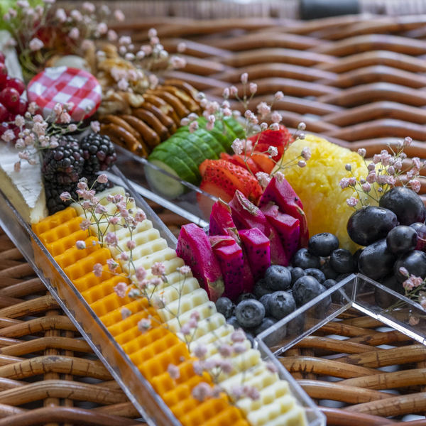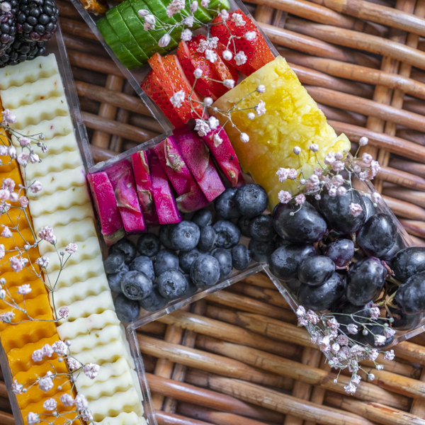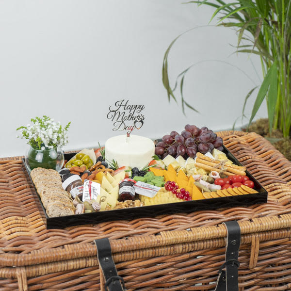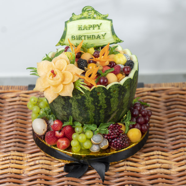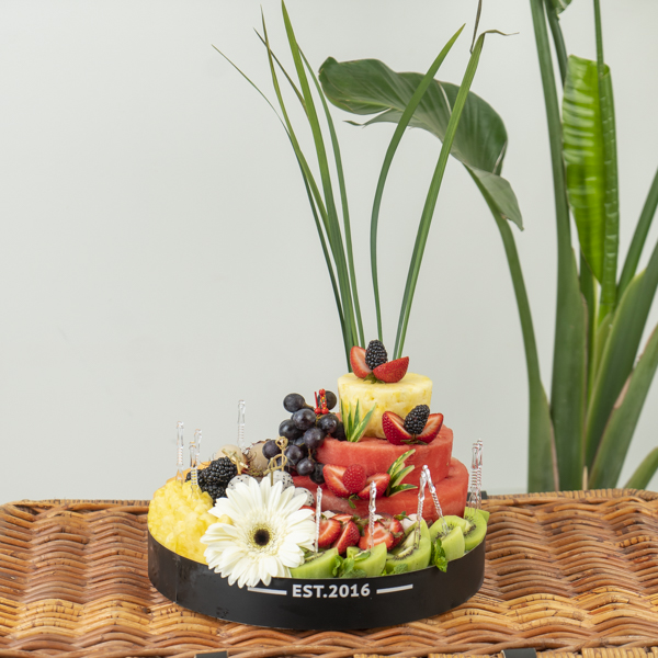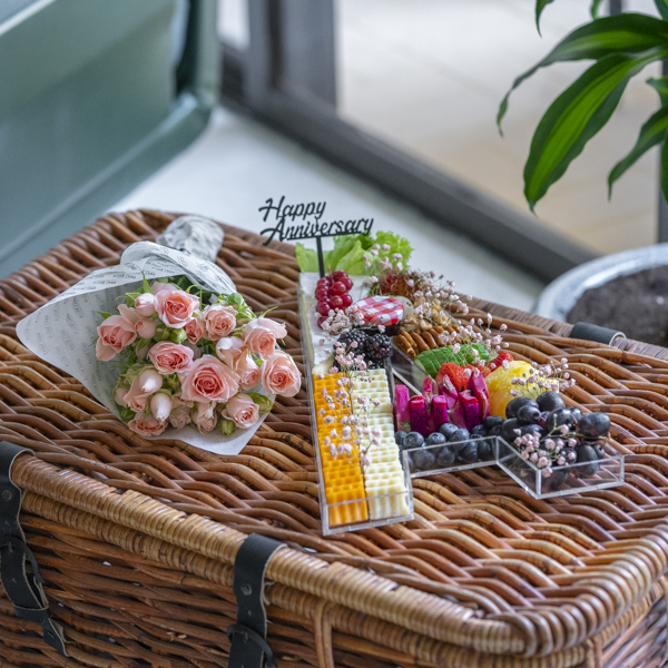 This arrangement contains letter shaped cheese and fruits tray with a hand bouquet of baby roses. All letters are available.