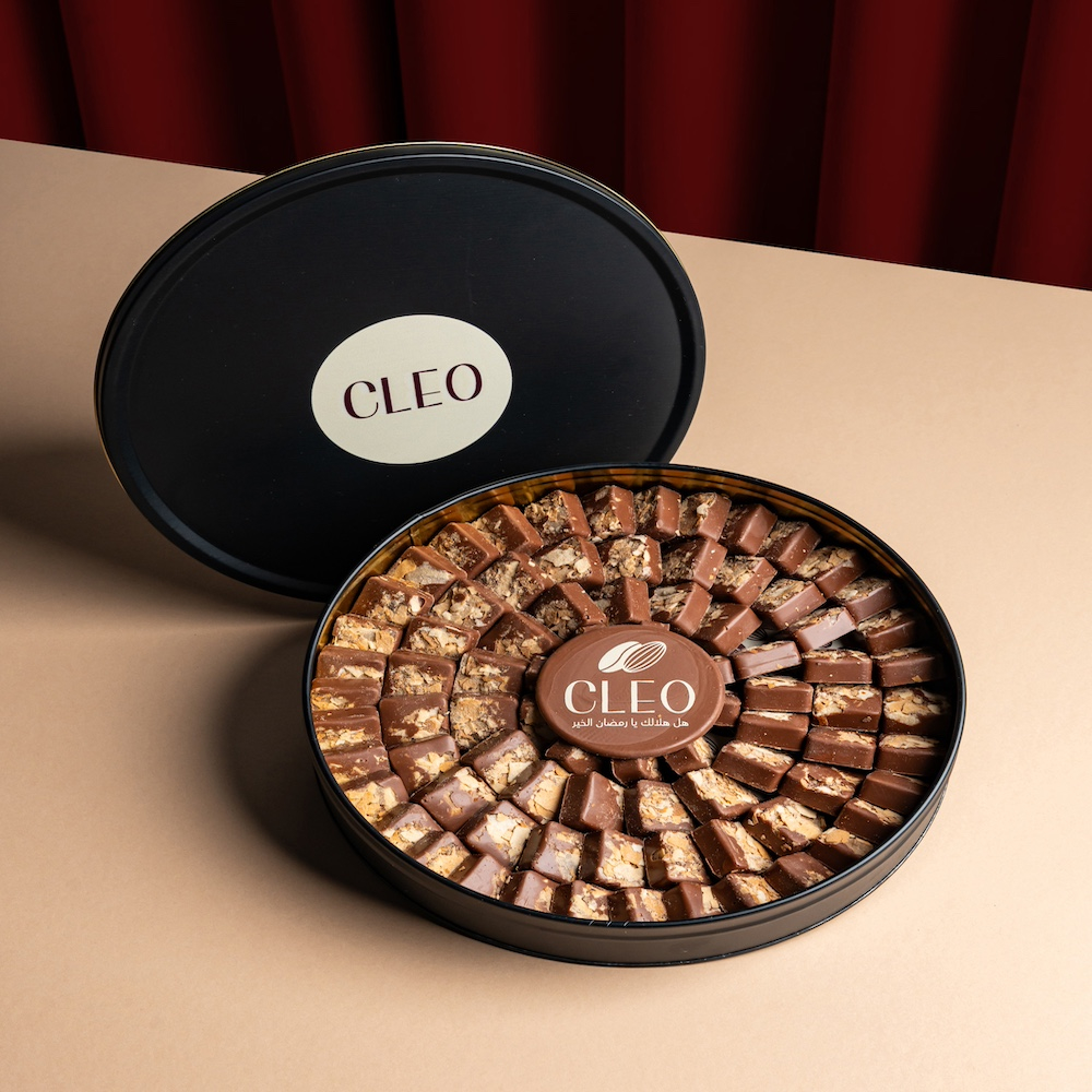 A metal box filled with 650g of Darabeel chocolates.