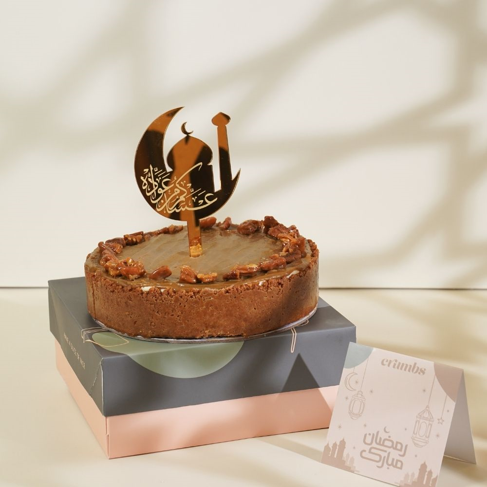 A cheesecake with the Arabic flavors we all love. Biscuit base with caramelized pecans, creamy cheesecake filling, topped with traditional Asida sauce and more caramelized nuts. Serves 6 to 8 people.
