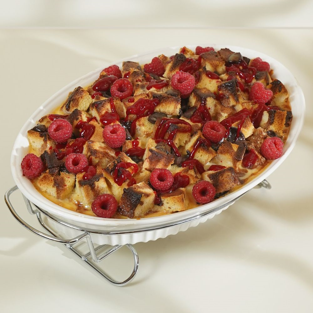 The best of both worlds, white, milk and dark chocolate in this bread pudding, with a side of raspberry sauce. Perfect for your next family gathering. Serves 8 to 10 people served in a Pyrex.