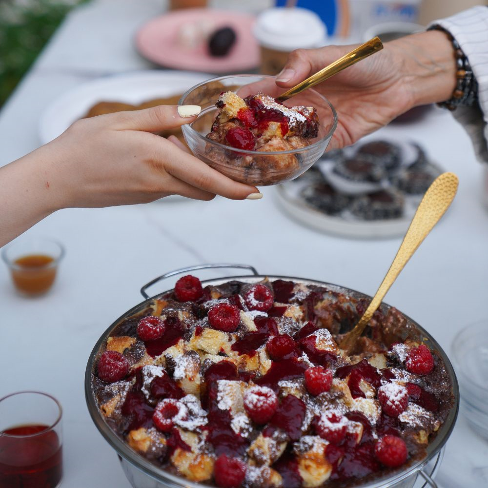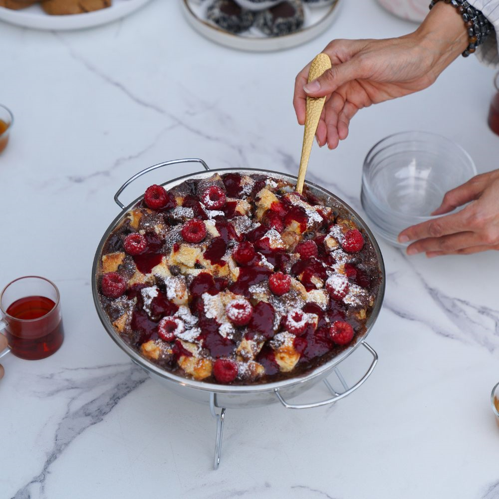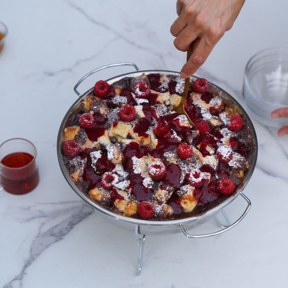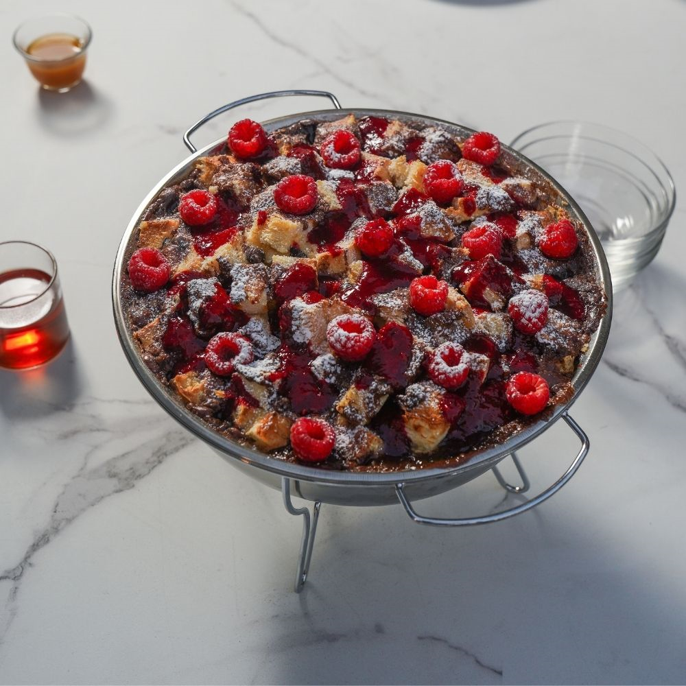 White, milk, and dark chocolate in this bread pudding, with a side of raspberry sauce. Perfect for your next family gathering. Serves 10 people served in a serving dish. Note: only the pudding is included.