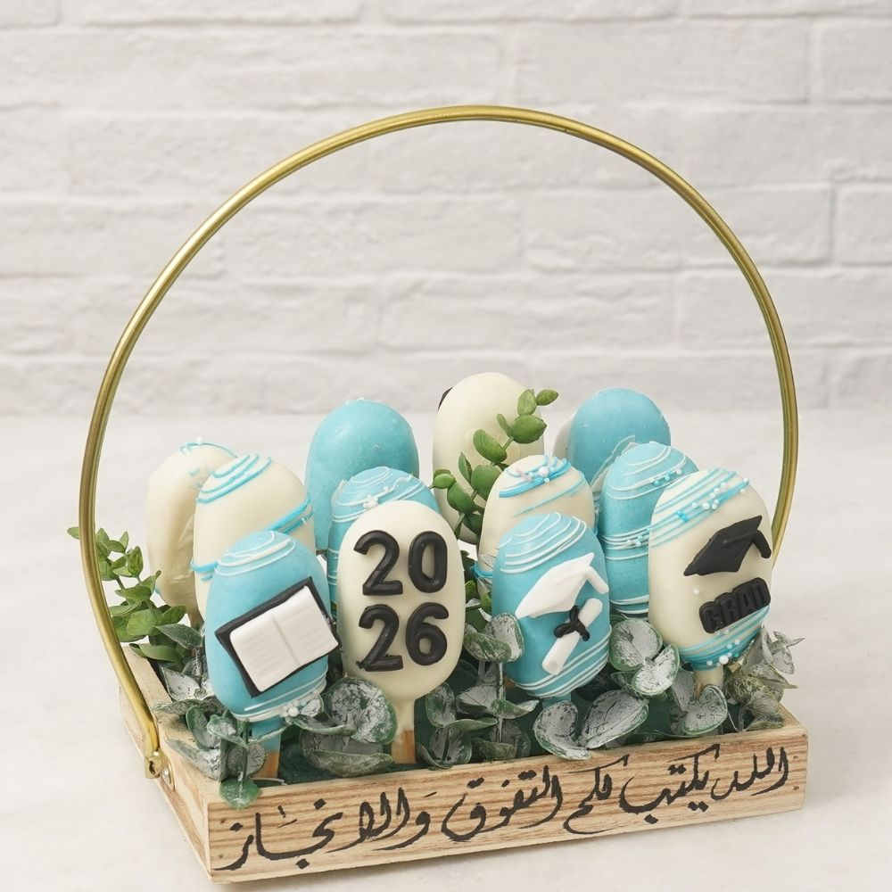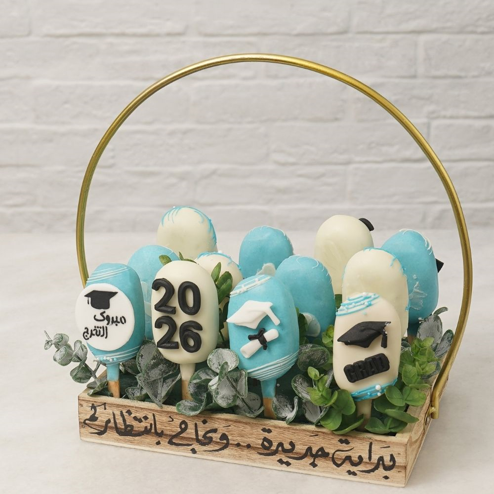 A set of 12 cakesickles in chocolate and vanilla flavors in graduation theme, each cakesickle will be individually wrapped to preserve freshness.