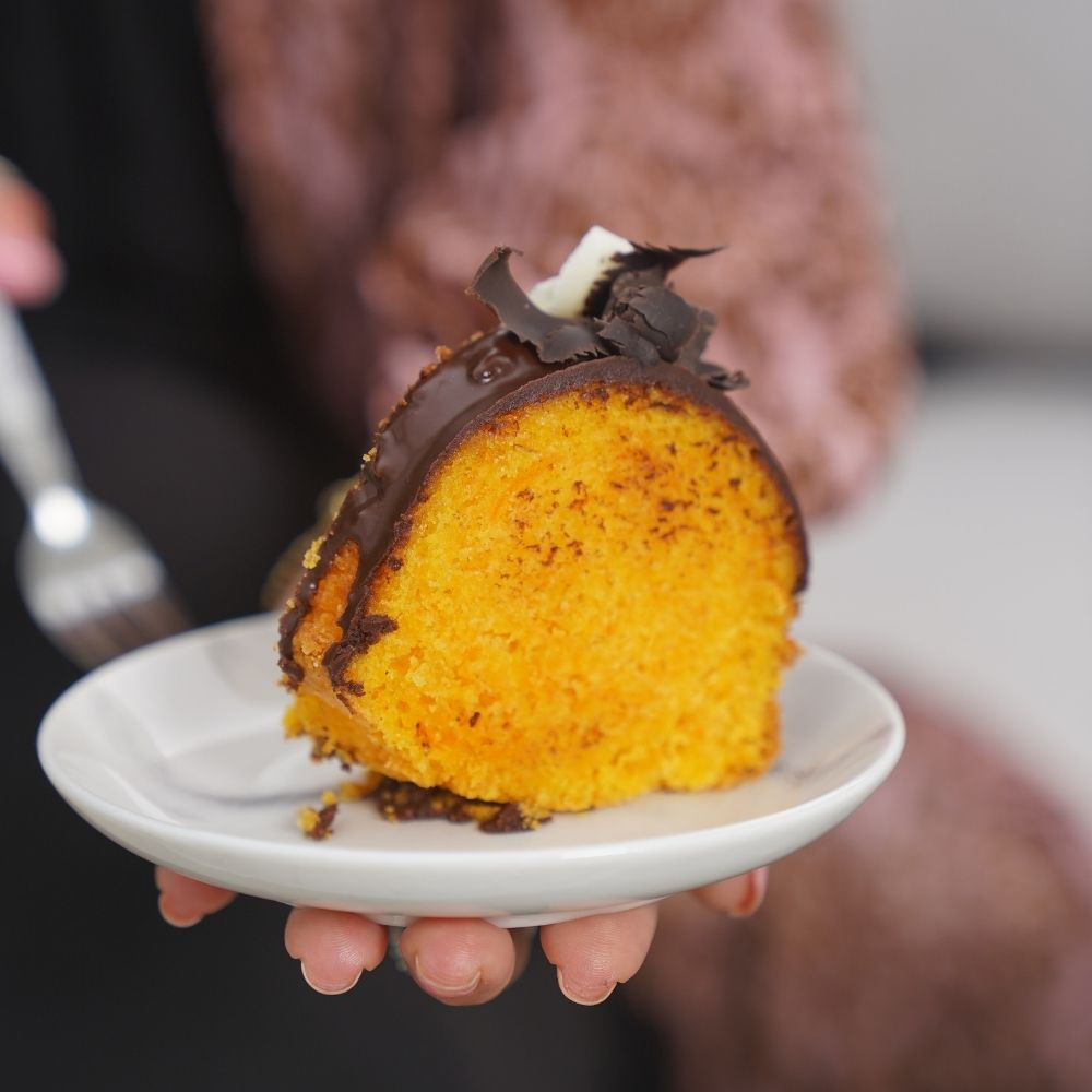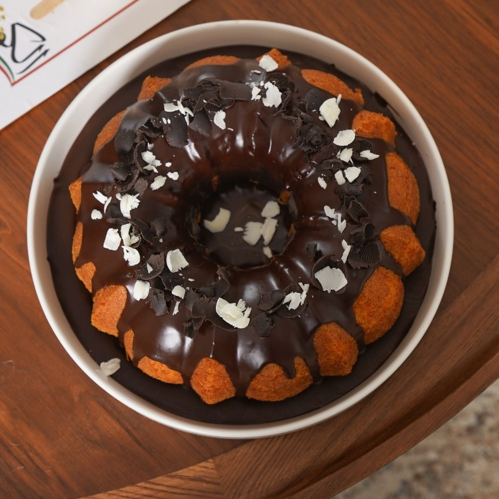 A moist and fluffy carrot cake topped with rich chocolate ganache, blending soft texture with deep, indulgent flavor for a perfectly balanced treat.