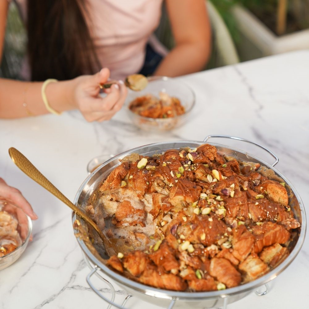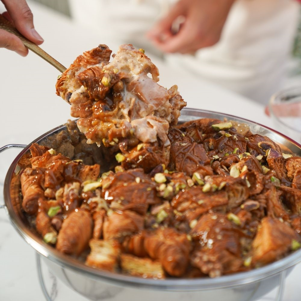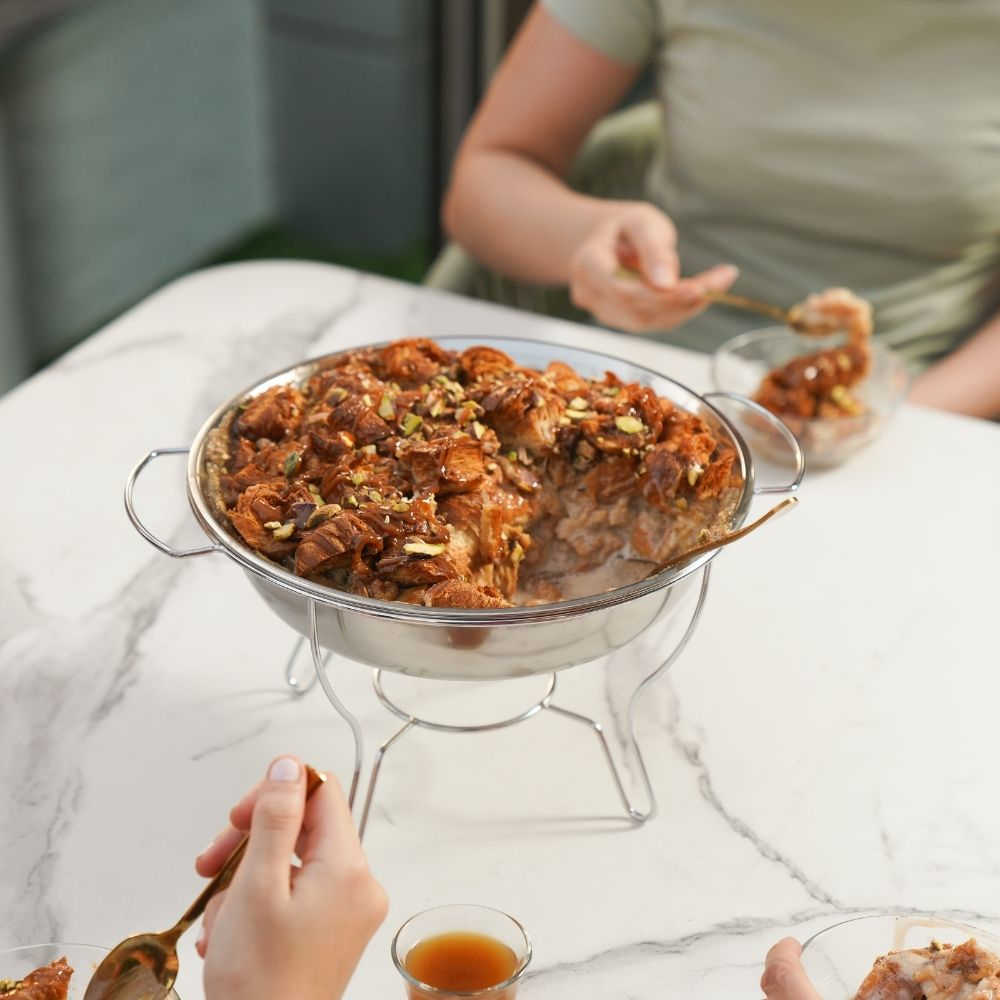 Soft cinnamon pudding with vanilla custard. Enough for 8 to 10 people, served in a stainless heating pot. Note: only the pudding is included.
