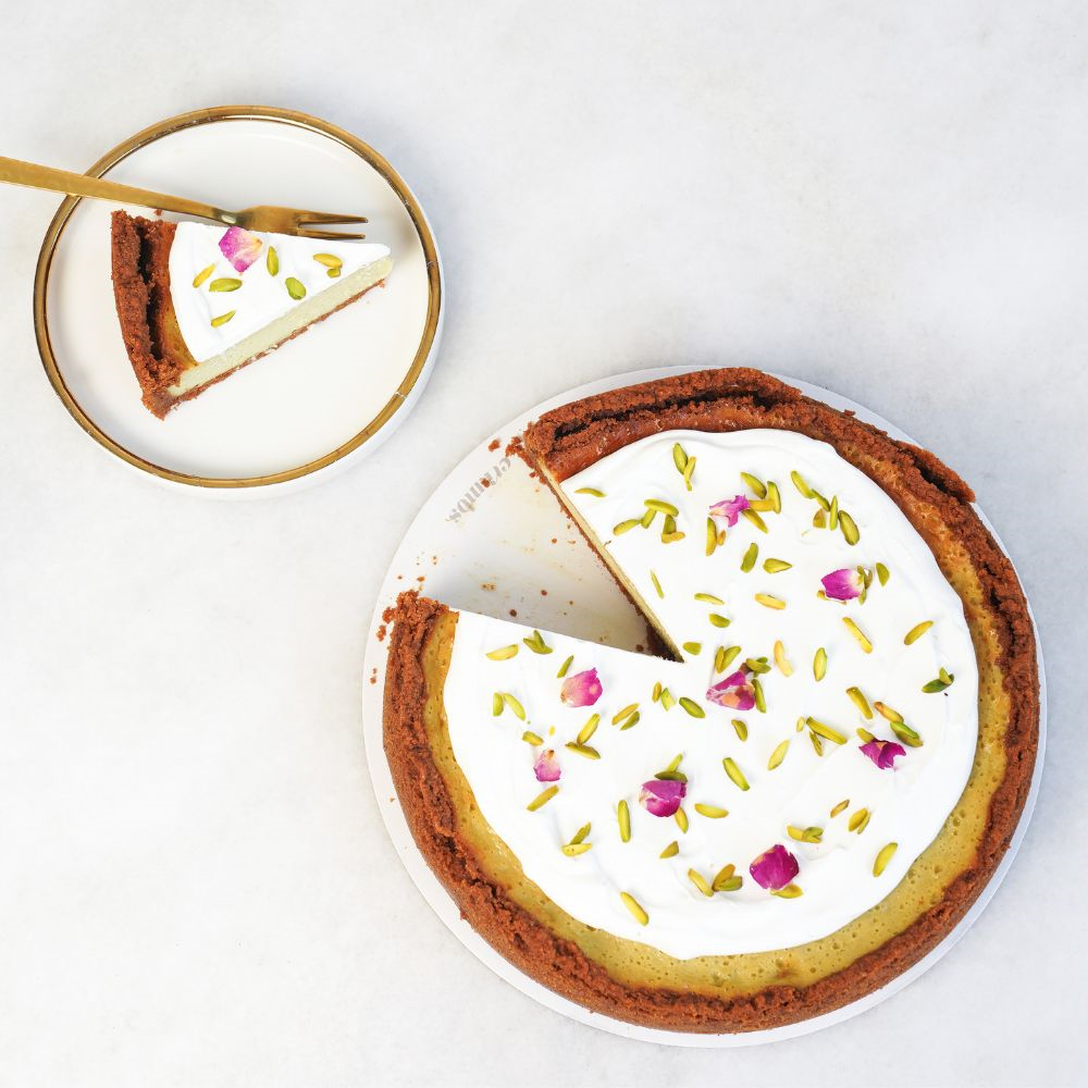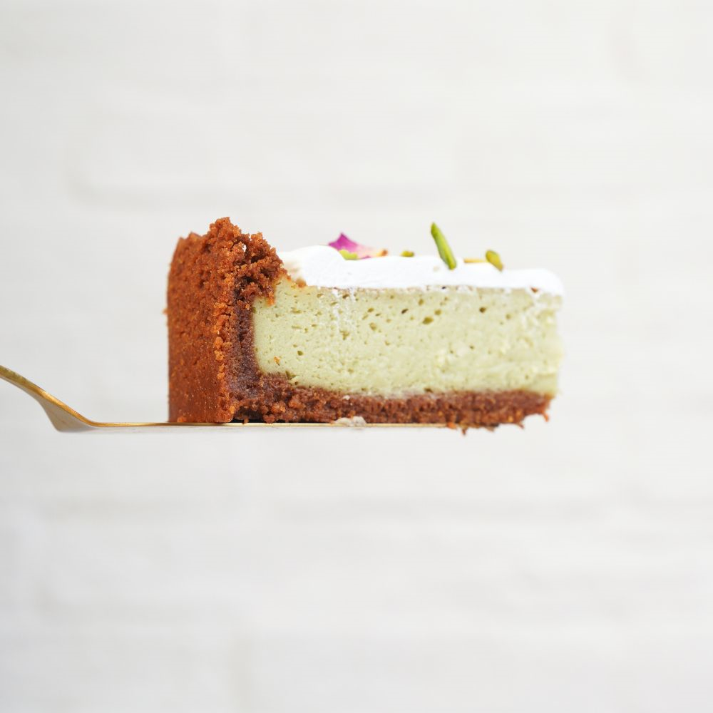 Pistachio cheesecake topped with creamy white hazelnut cream and rose petals 7-inch cheesecake Serve 6 to 8 persons.