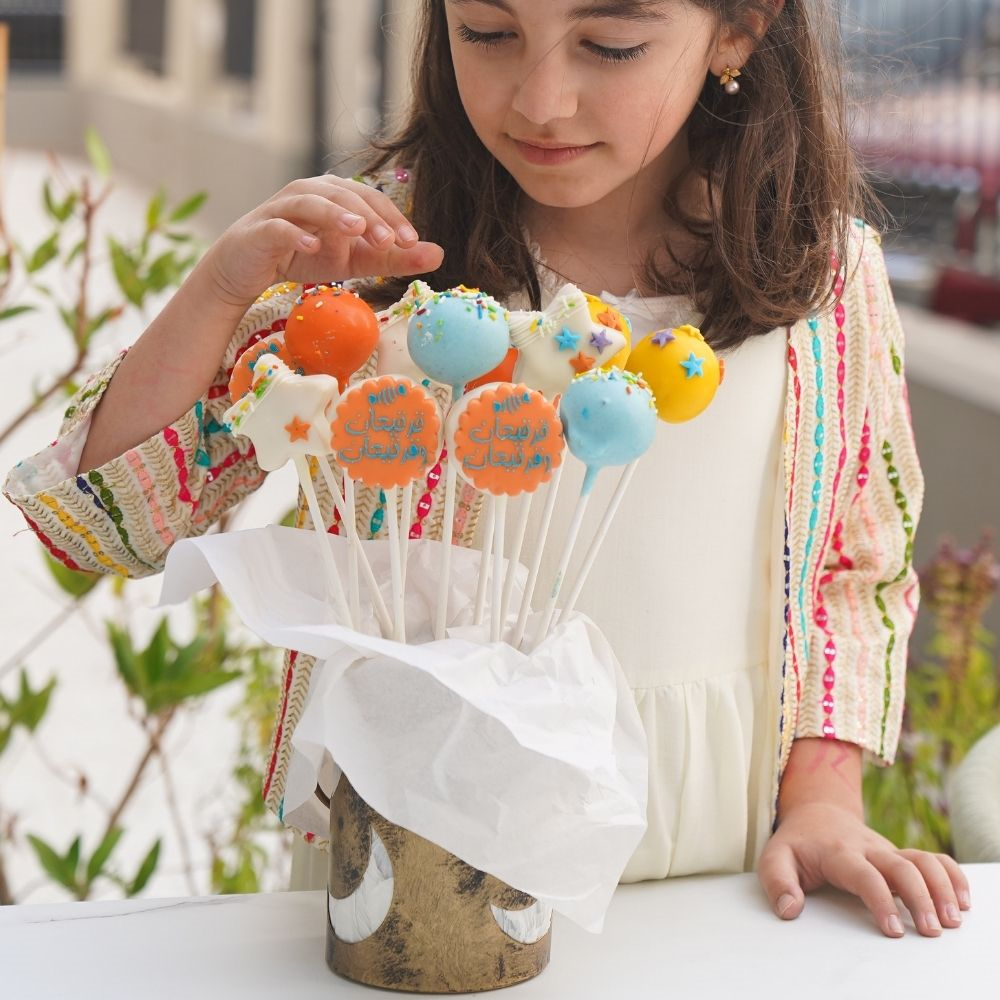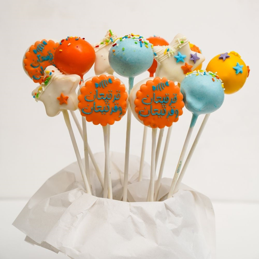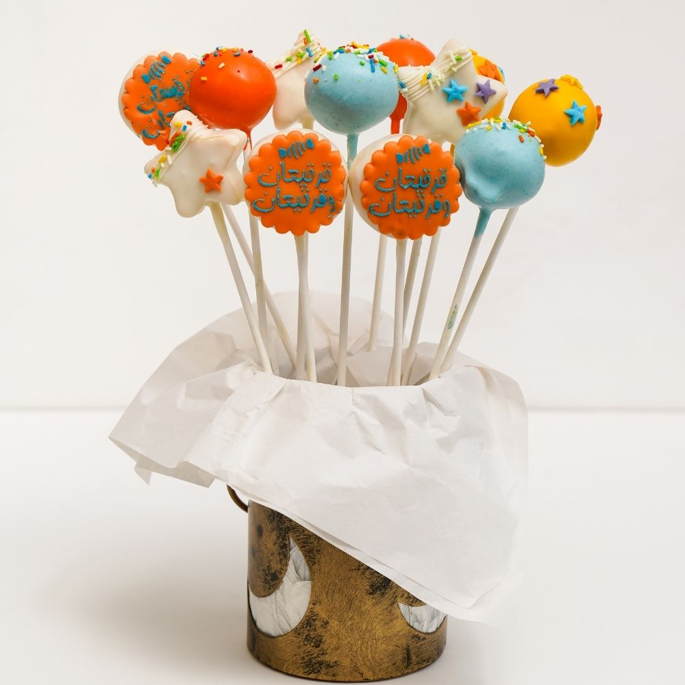 A vase featuring 12 pieces of Gergean cake pops in chocolate and vanilla flavor individually wrapped.