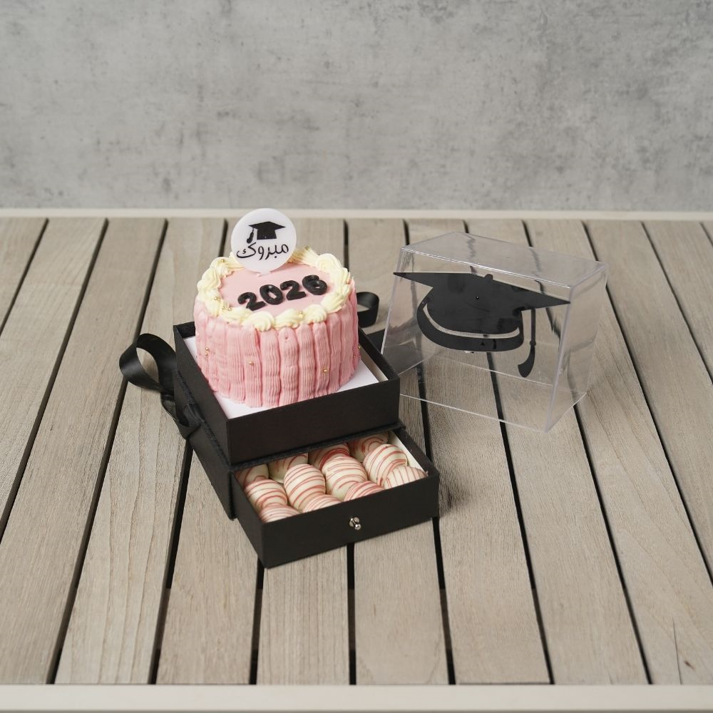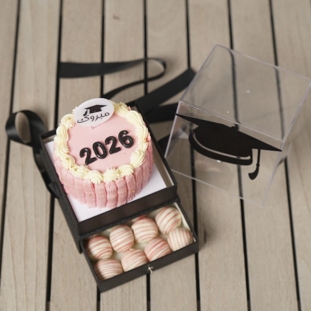 A lovely combination of a 4-inch mini chocolate cake, serving 2 people, and 12 pieces of red velvet cake bites, presented in an elegant acrylic box.