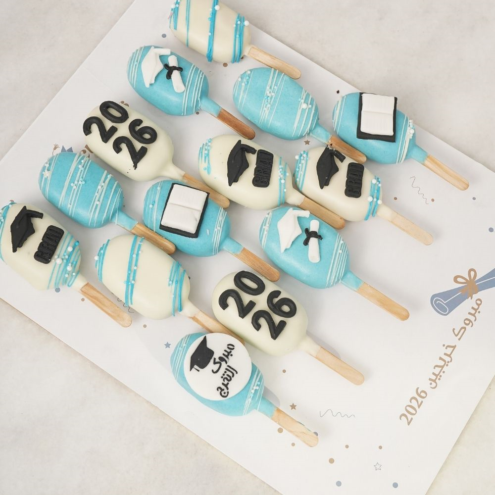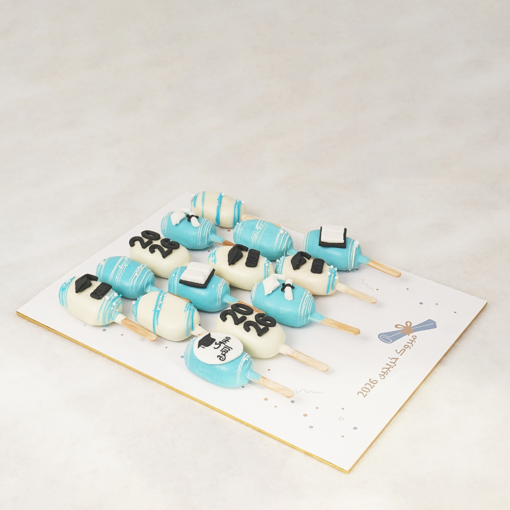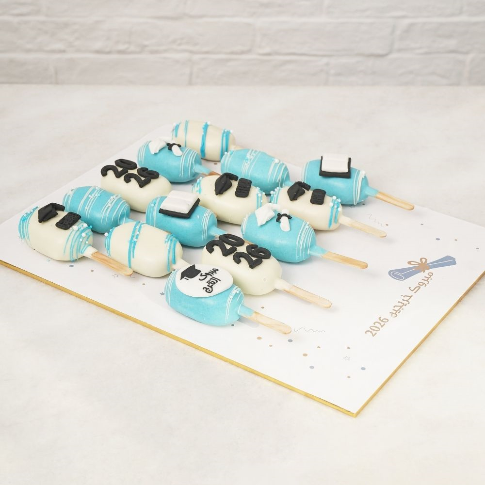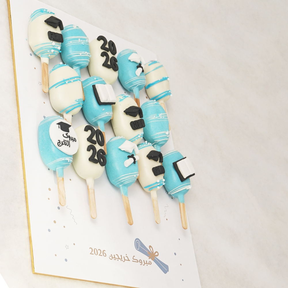 A board of 14 graduation themed cakesicles in chocolate and vanilla flavors.