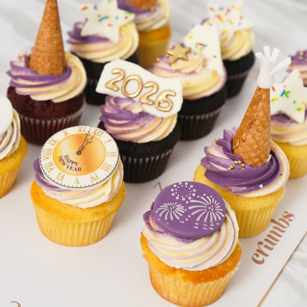 The best Crumbs cupcakes in chocolate, vanilla, and red velvet flavors, beautifully decorated to celebrate the new year 2026. Perfect treats to ring in the festivities with delightful sweetness and festive designs. Served on a board.