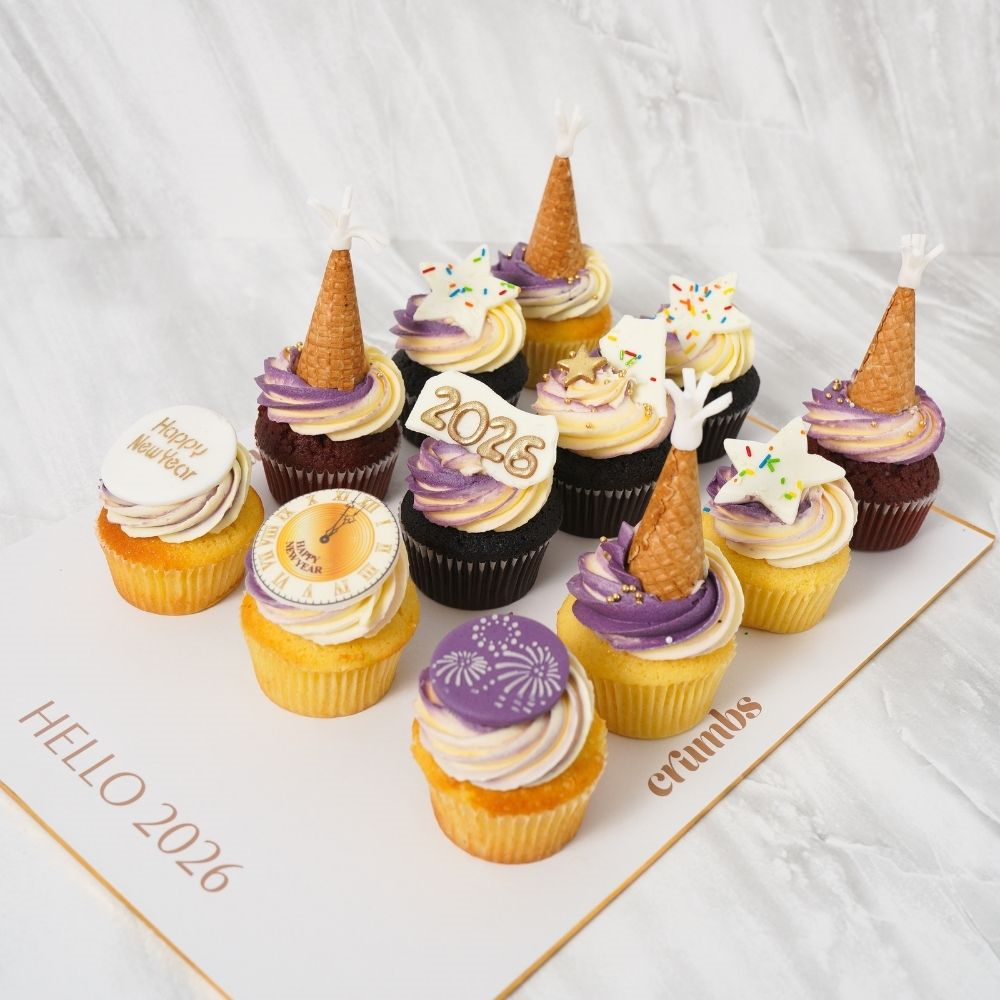 The best Crumbs cupcakes in chocolate, vanilla, and red velvet flavors, beautifully decorated to celebrate the new year 2026. Perfect treats to ring in the festivities with delightful sweetness and festive designs. Served on a board.