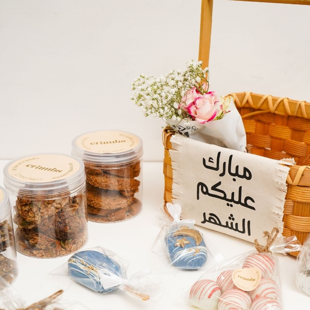 Crumbs' best-sellers include: - Maple pistachio granola. - Zaatar crackers. - Fig crackers. - Sweet cinnamon crackers. - Ramadan decoration. - Cakesickles. - Vegan chocolate date cookies. - Red velvet cake bites. - Mini roses bouquet. All presented in an elegant basket.