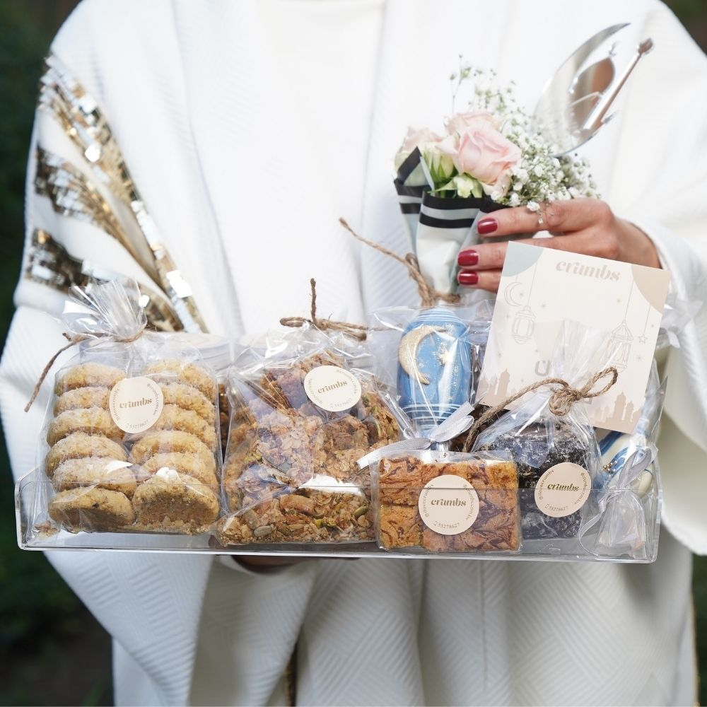 Crumbs' best-sellers include: - A 4-inch bento cake. - Maple pistachio granola. - Zaatar crackers. - Fig crackers. - Sweet cinnamon crackers. - Oatmeal raspberry cookies. - Decorated cakesickles. - Rahash blondies. - Red velvet cake bites. - Mini roses bouquet. All presented in an elegant acrylic tray with a Ramadan topper.