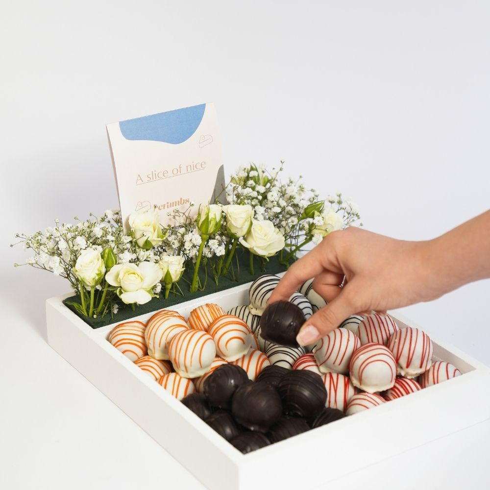 45 cake bites in 4 flavors: chocolate, red velvet, oreo, and carrot in an elegant wooden tray with flowers.