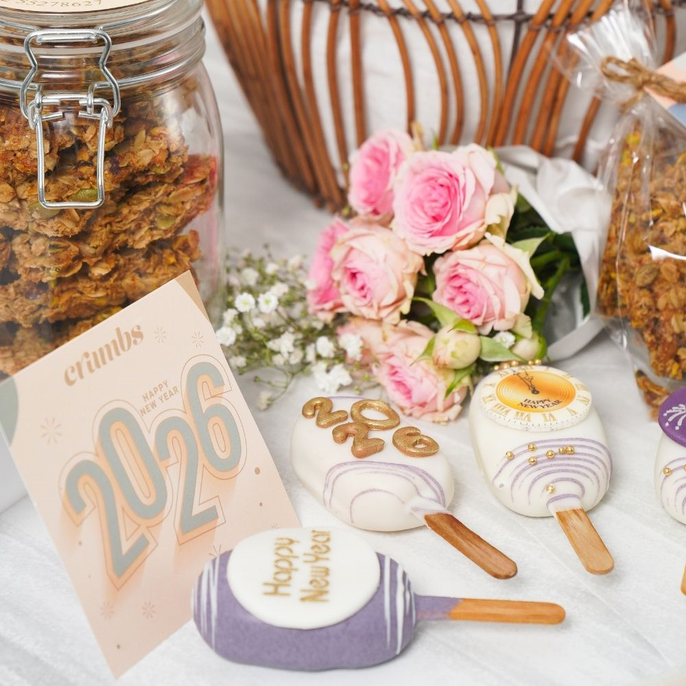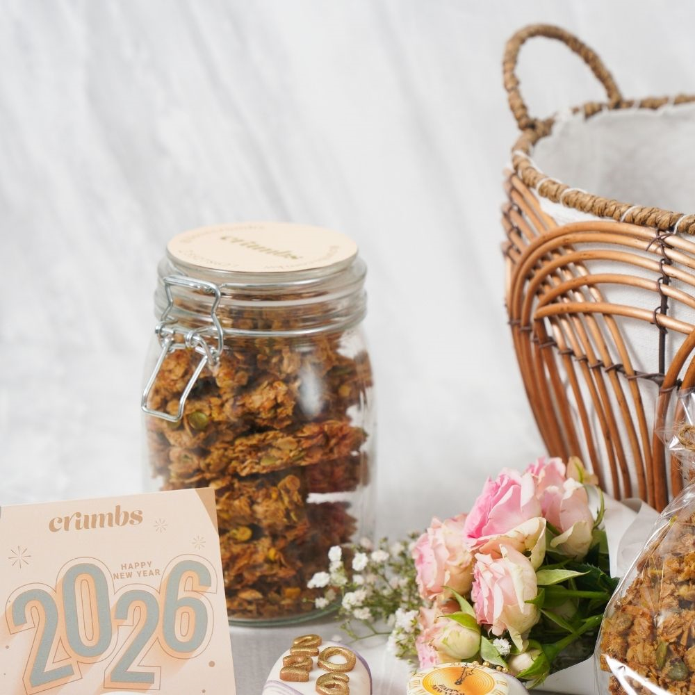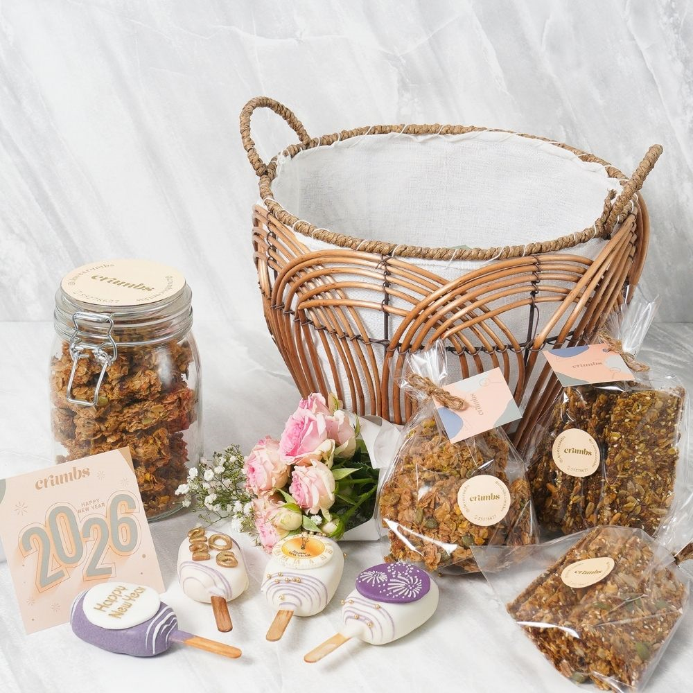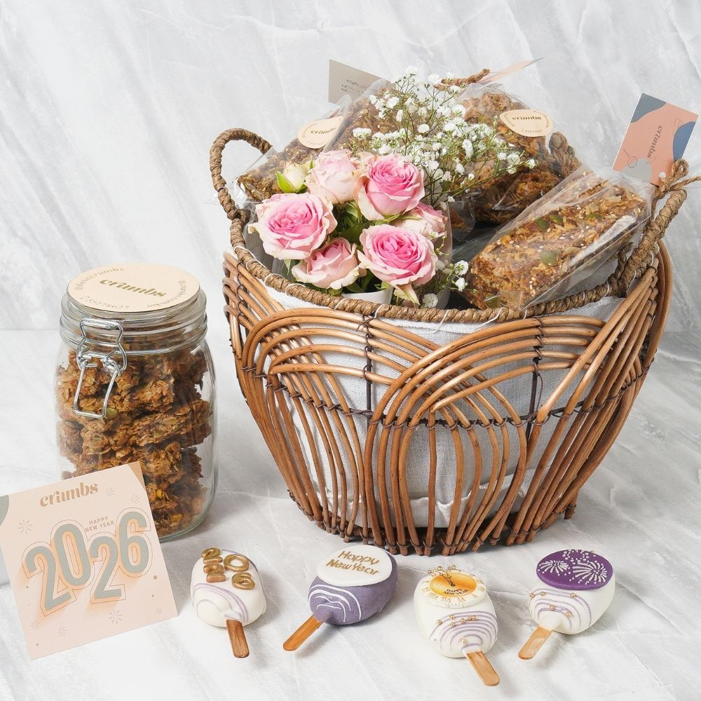 Crumbs best-sellers include maple pistachio granola, zaatar and figs crackers, 4 cakesickles, and a bouquet of roses, all presented in an elegant basket.