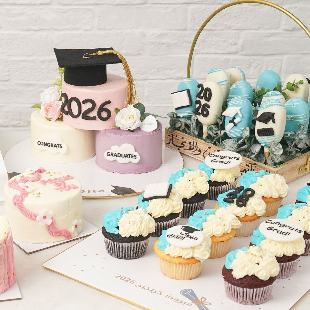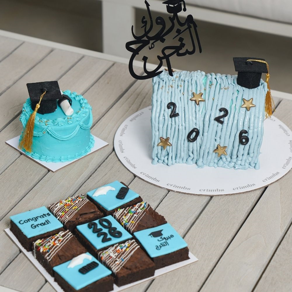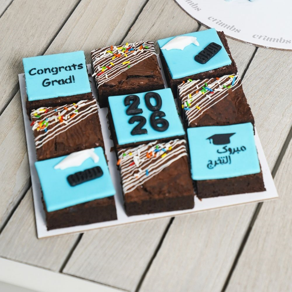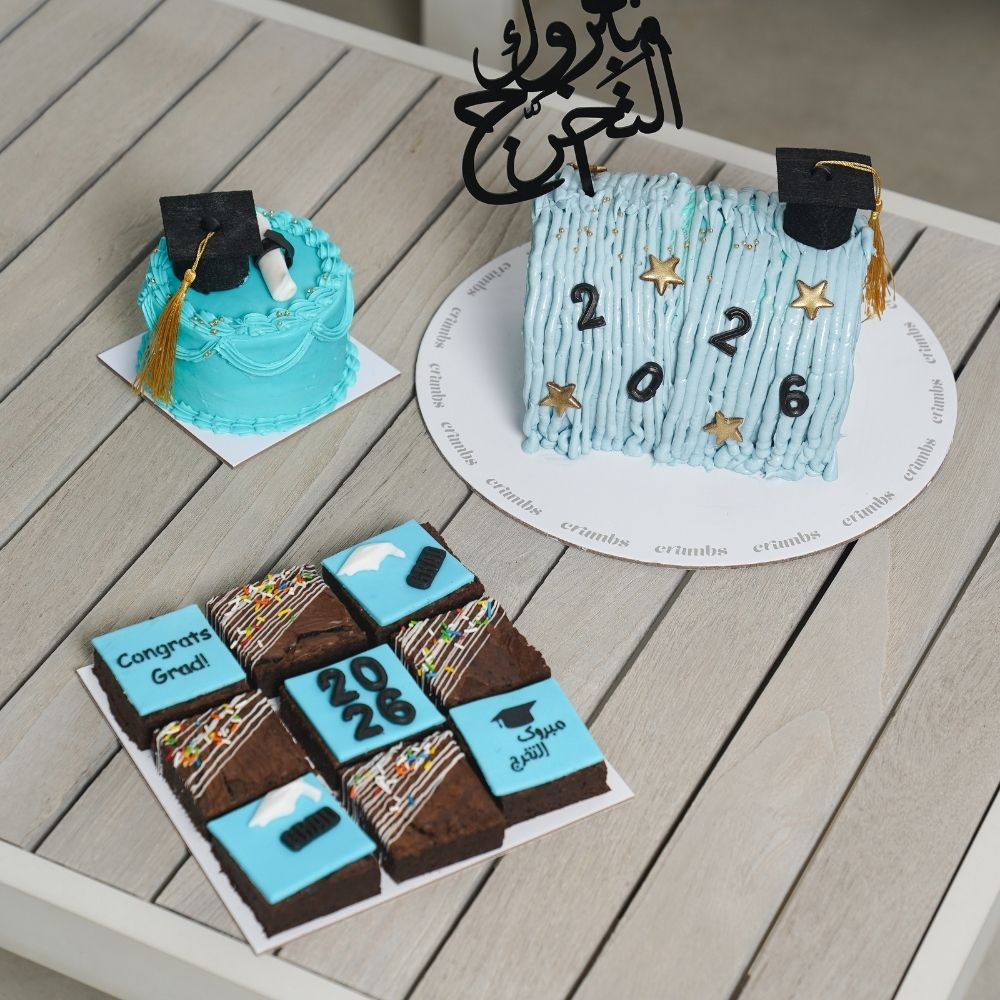 This package includes a chocolate cake serving 5 to 7 people, 9 graduation-themed brownies, and a chocolate graduation bento cake. Perfect for a sweet and memorable celebration.