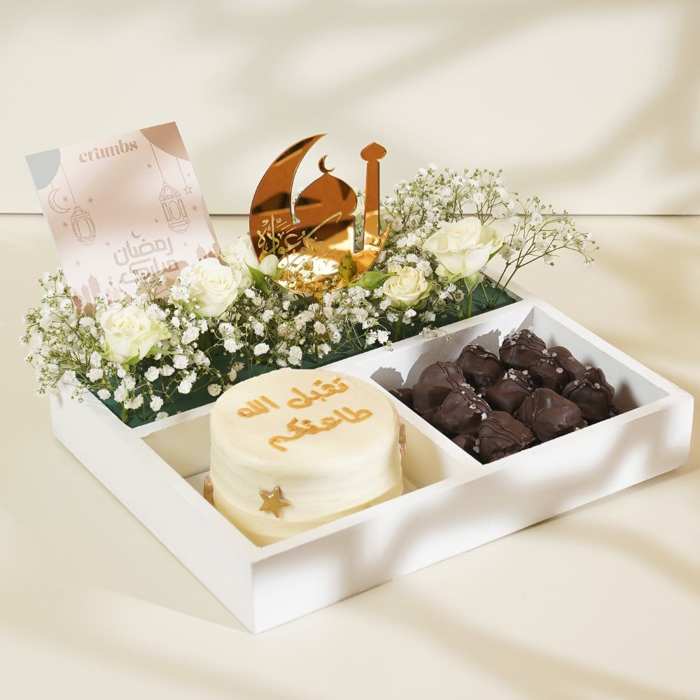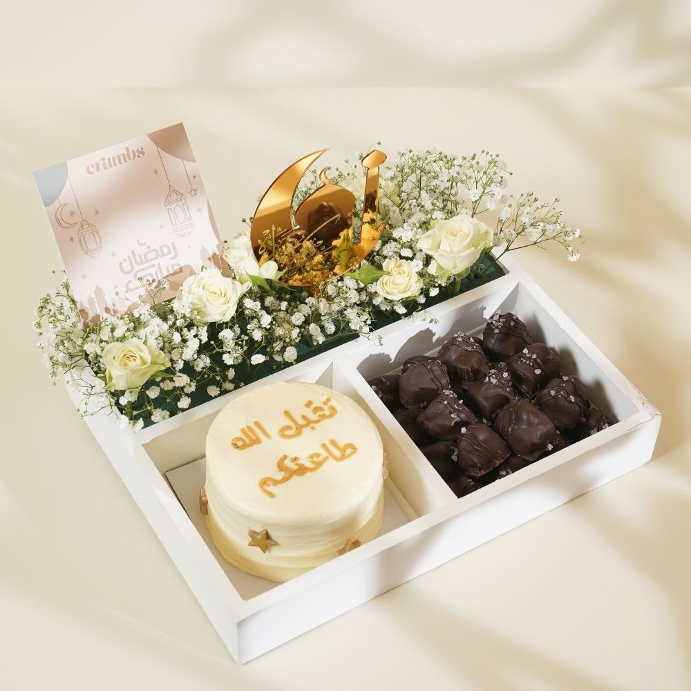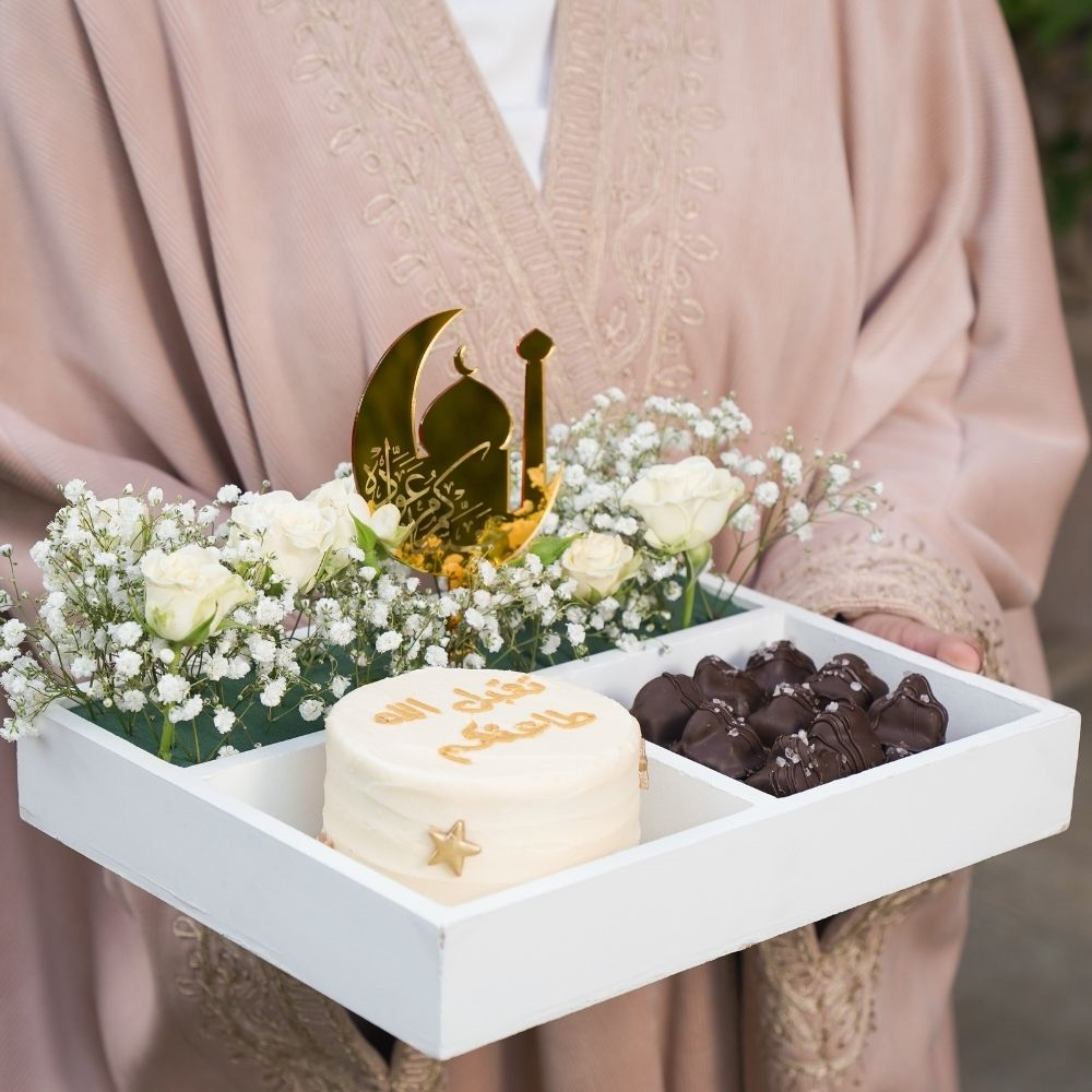A 4-inch bento cake with 22 pieces of vegan cashew chocolates and a Ramadan topper, beautifully arranged in an elegant wooden tray with flowers.