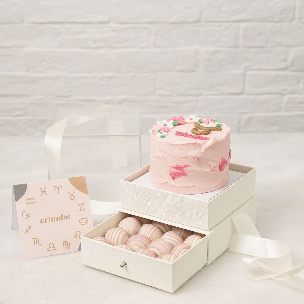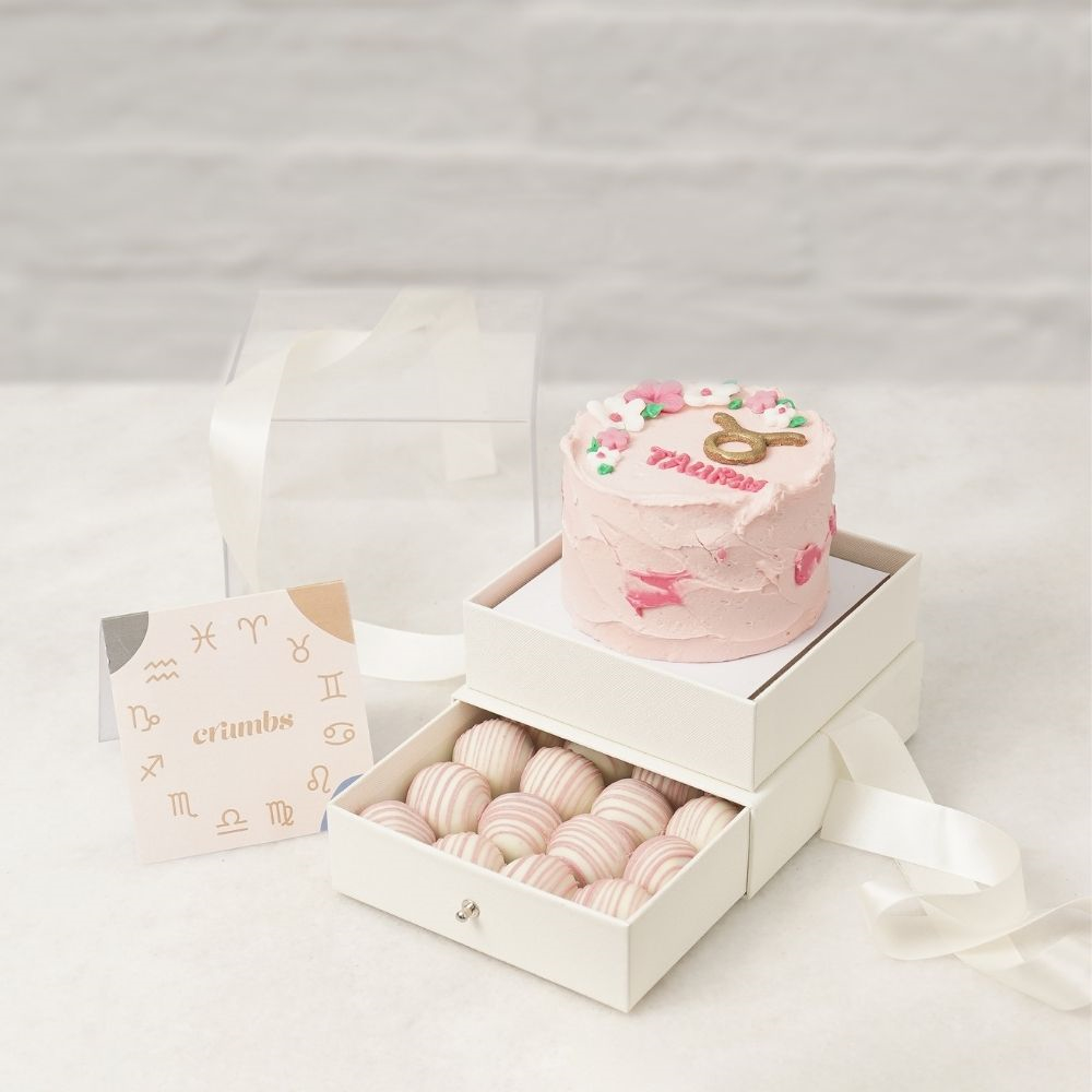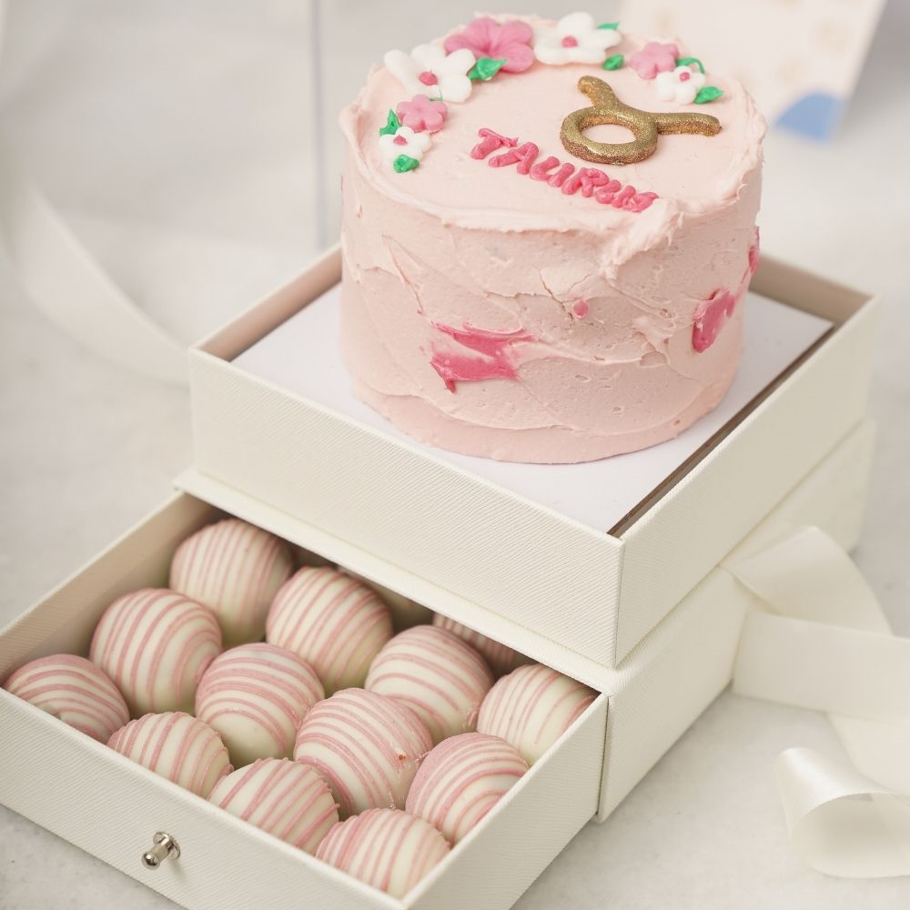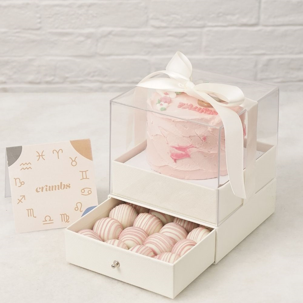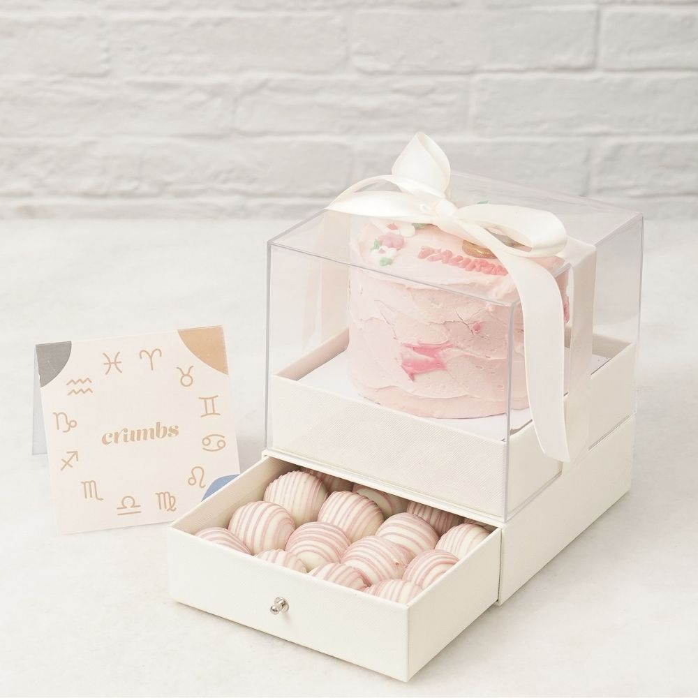 An elegant acrylic box featuring 4-inch mini chocolate cake, serving 2 people, and 12 pieces of red velvet cake pops.