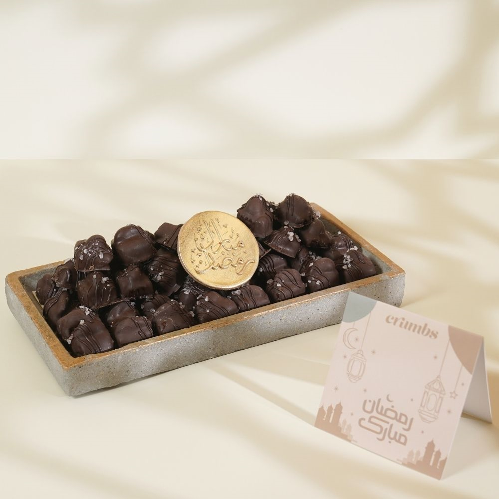 An elegant tray featuring 50 cashew caramel dates coated in dark chocolate, beautifully arranged to make your Ramadan gathering more special.
