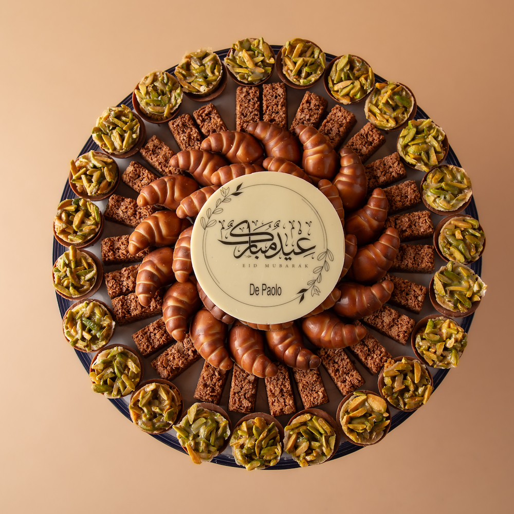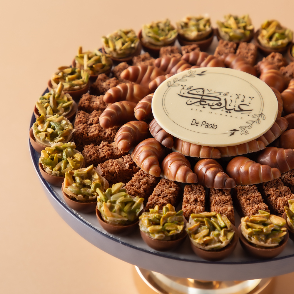 An elegant crystal tray with a golden base, featuring 0.770 kg of premium Belgian chocolate with Signature Pistachio, Choco Crunchy, and Kunafa Pistachio fillings, beautifully decorated with a distinctive cocoa greeting: “Eidkum Mubarak.”