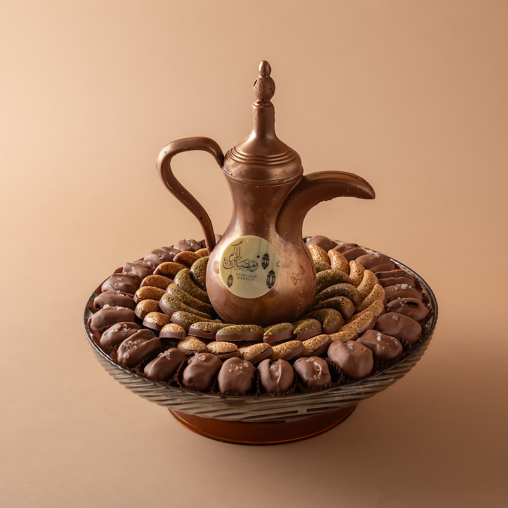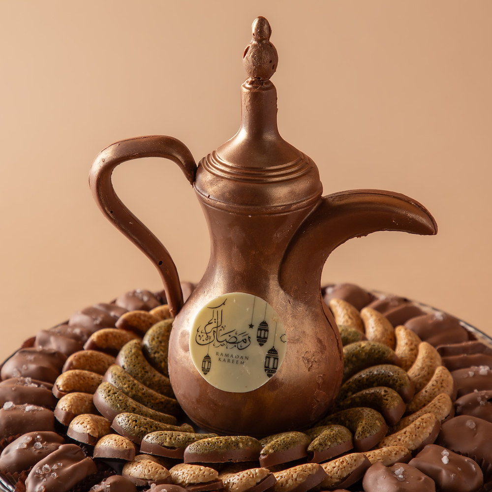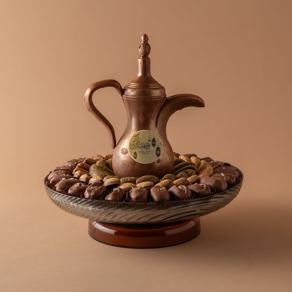 A luxurious vase adorned with a coffee cup and a Ramadan phrase made from chocolate, accompanied by a selection of premium Ramadan chocolates from our exclusive range, creates a refined and innovative gift for the holy month.