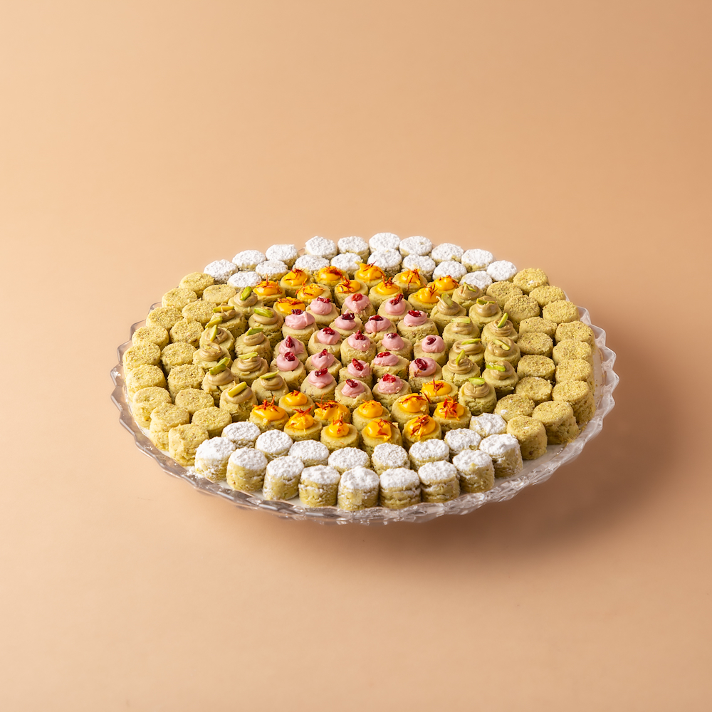 An elegant crystal tray featuring 0.63 kg of special ghraybah in assorted flavors.