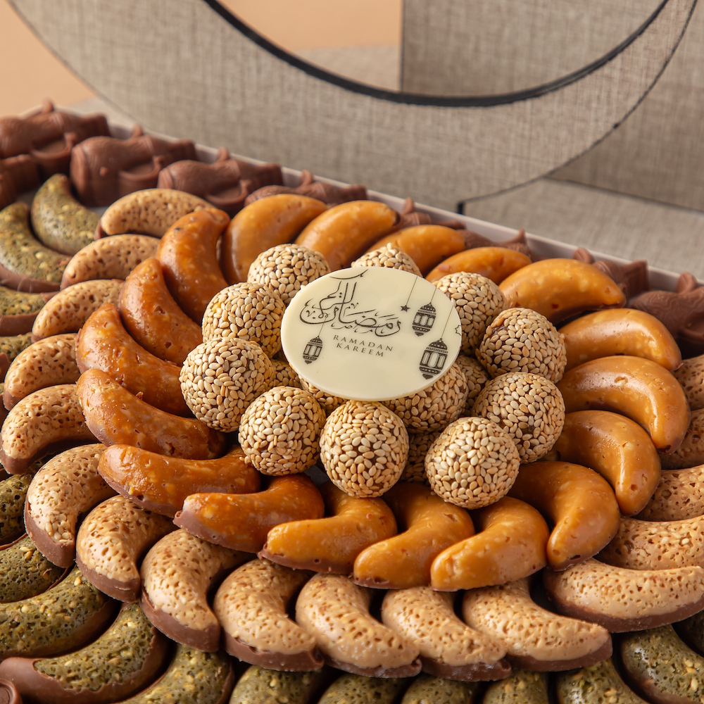 A wooden tray from our signature designs, featuring a Ramadan phrase and filled with Ramadan-themed chocolates, sesame chocolates, and zaatar chocolates.