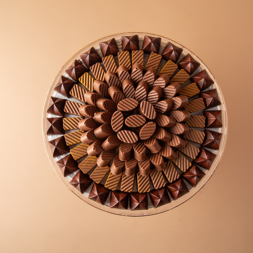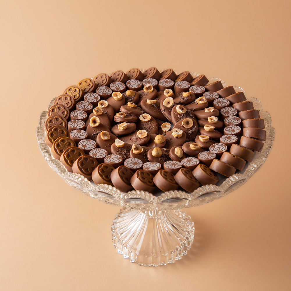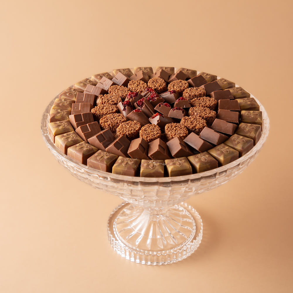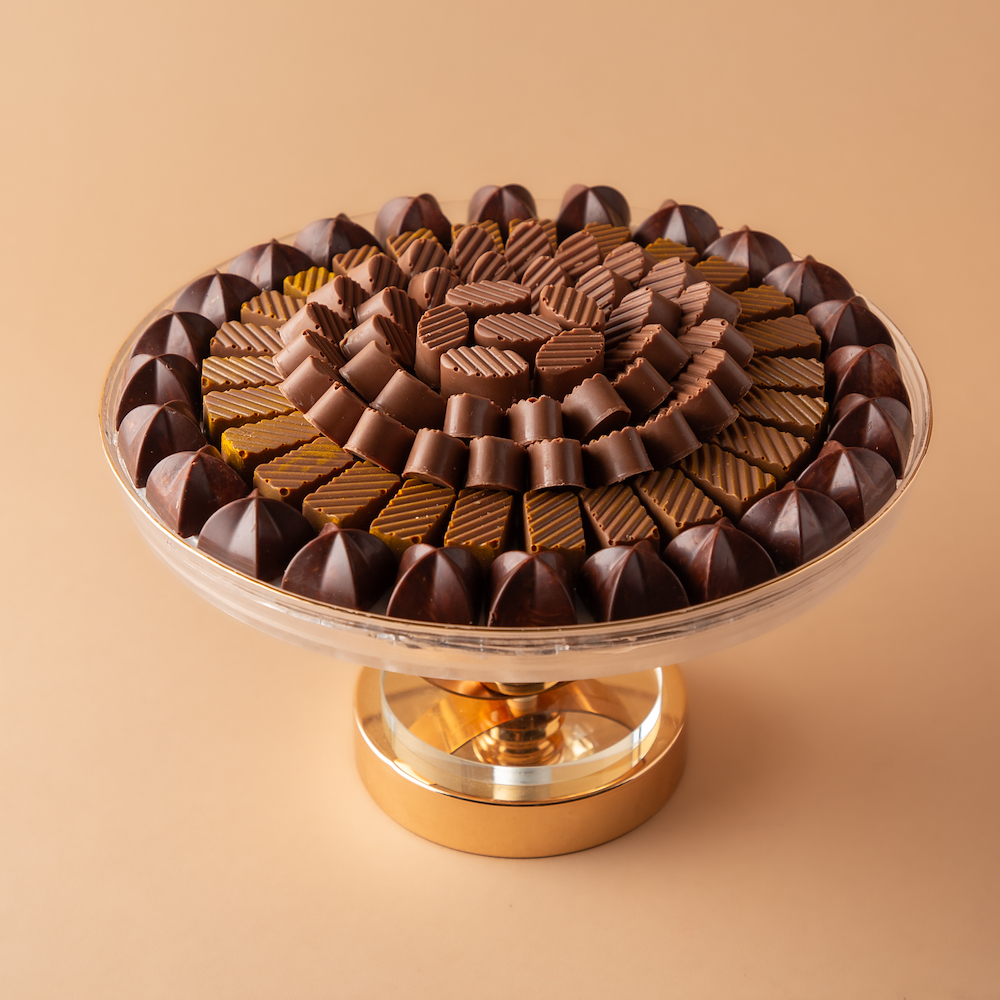 An elegant crystal tray with a luxurious gold base, featuring 0.750 kg of premium Belgian chocolate filled with Nutella wafer, berry cheesecake, and pistachio, with a customized chocolate message added to suit the occasion. A perfect choice for refined hospitality and luxurious gifting with a personalized touch.