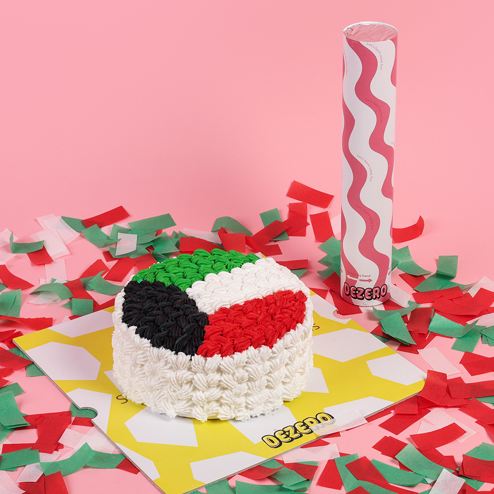 A special decorated cake with Kuwait flag and fireworks in the colors of the Kuwaiti flag.