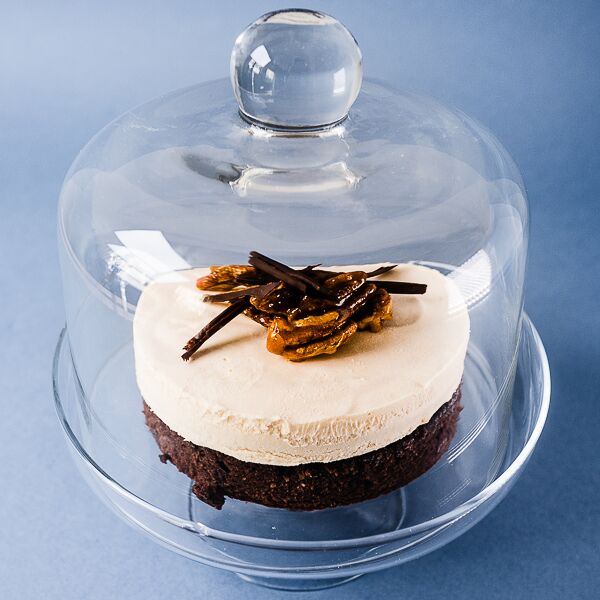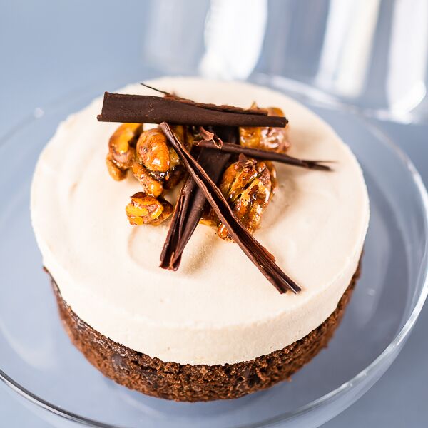 Ice cream cake rich in caramel and praline and decorated in walnuts and chocolate flakes.