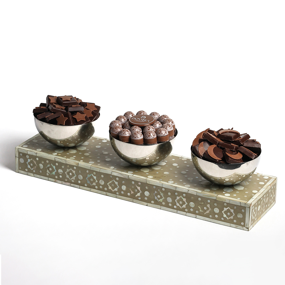 An elegant naqsa tray featuring one full kilogram of delicious treats, presented in a stunning decorative tray crafted from beautiful seashells, perfect for celebrating ramadan.