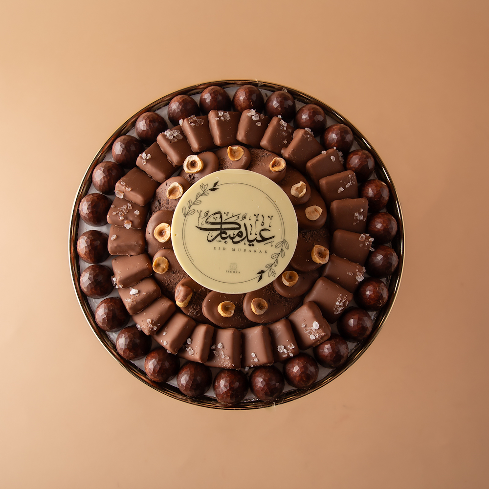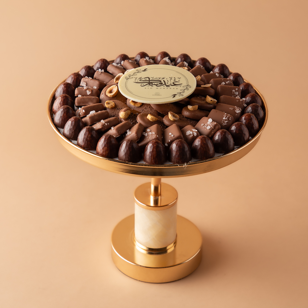 An elegant golden tray filled with a selection of premium chocolates featuring distinctive fillings including manouza hazelnut, Richard, and salted peanuts.