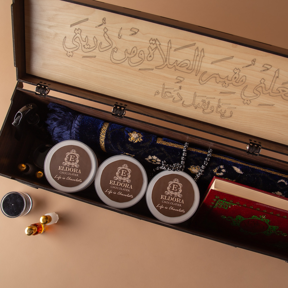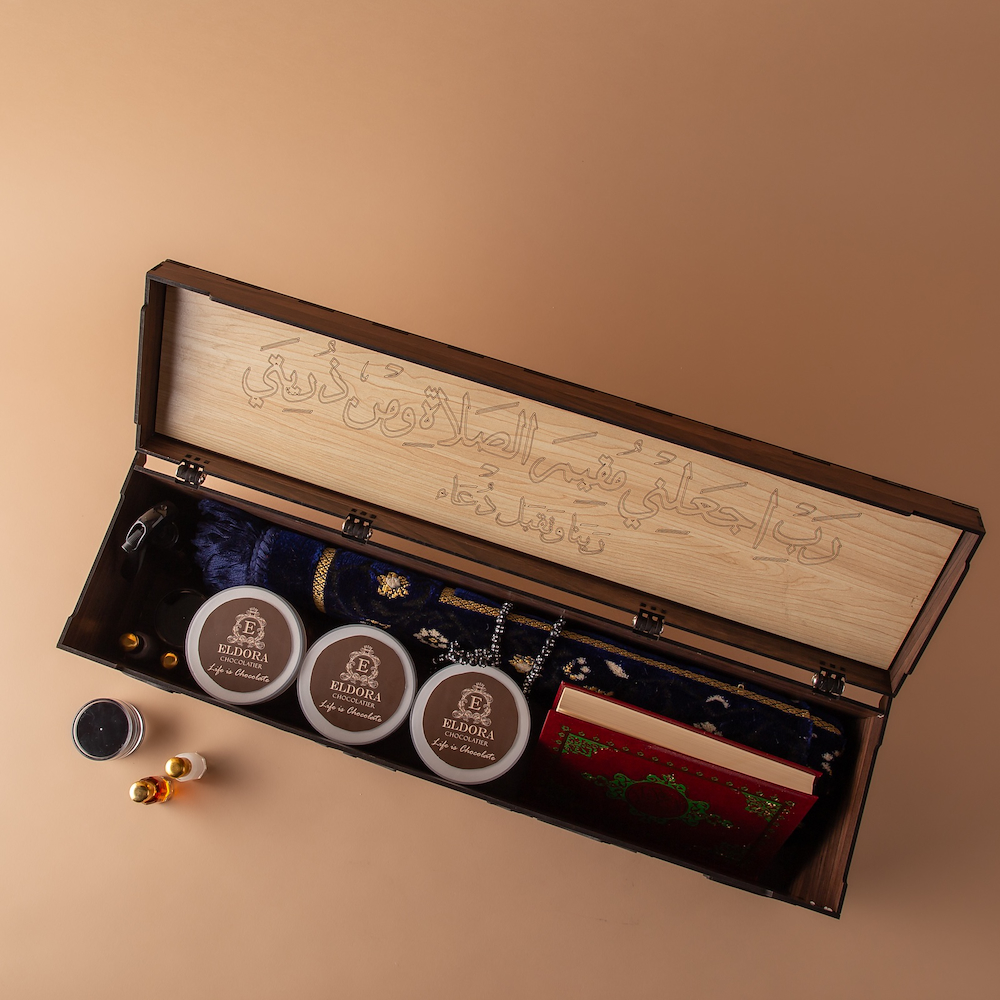 A luxury wooden box from our exclusive designs, adorned with elegant Ramadan phrases, blending sophistication and spirituality into a refined gift for the holy month. Contents: Ramadan chocolate jar, traditional Arabic coffee jar, mixed nuts jar, a fragrance spray, premium oud oil, musk, royal maamoul, Holy Quran, and a prayer mat.
