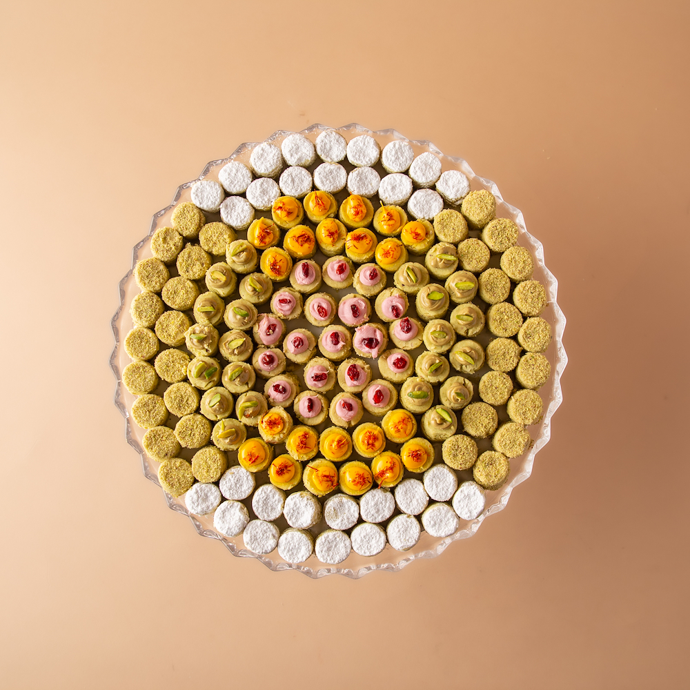 An elegant crystal tray featuring 0.67 kg of special ghraybah in assorted flavors.