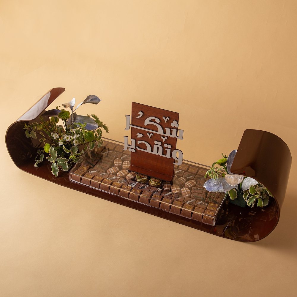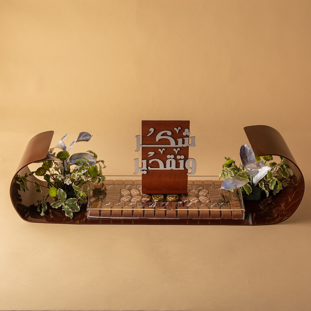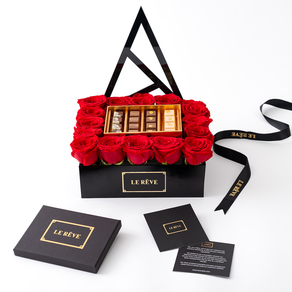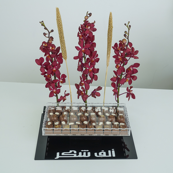 An acrylic tray filled with 755 grams of assorted chocolates, decorated with flowers.