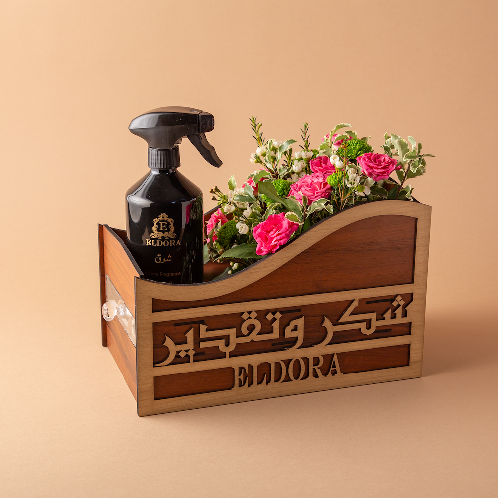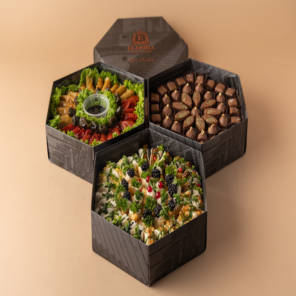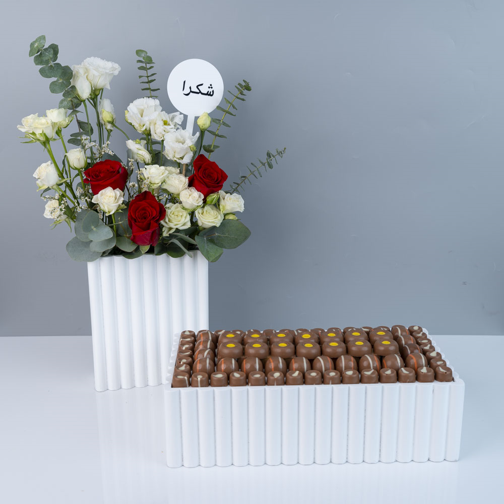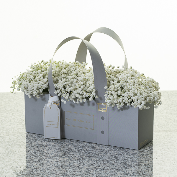 An acrylic tray filled with 755 grams of assorted chocolates, decorated with flowers.