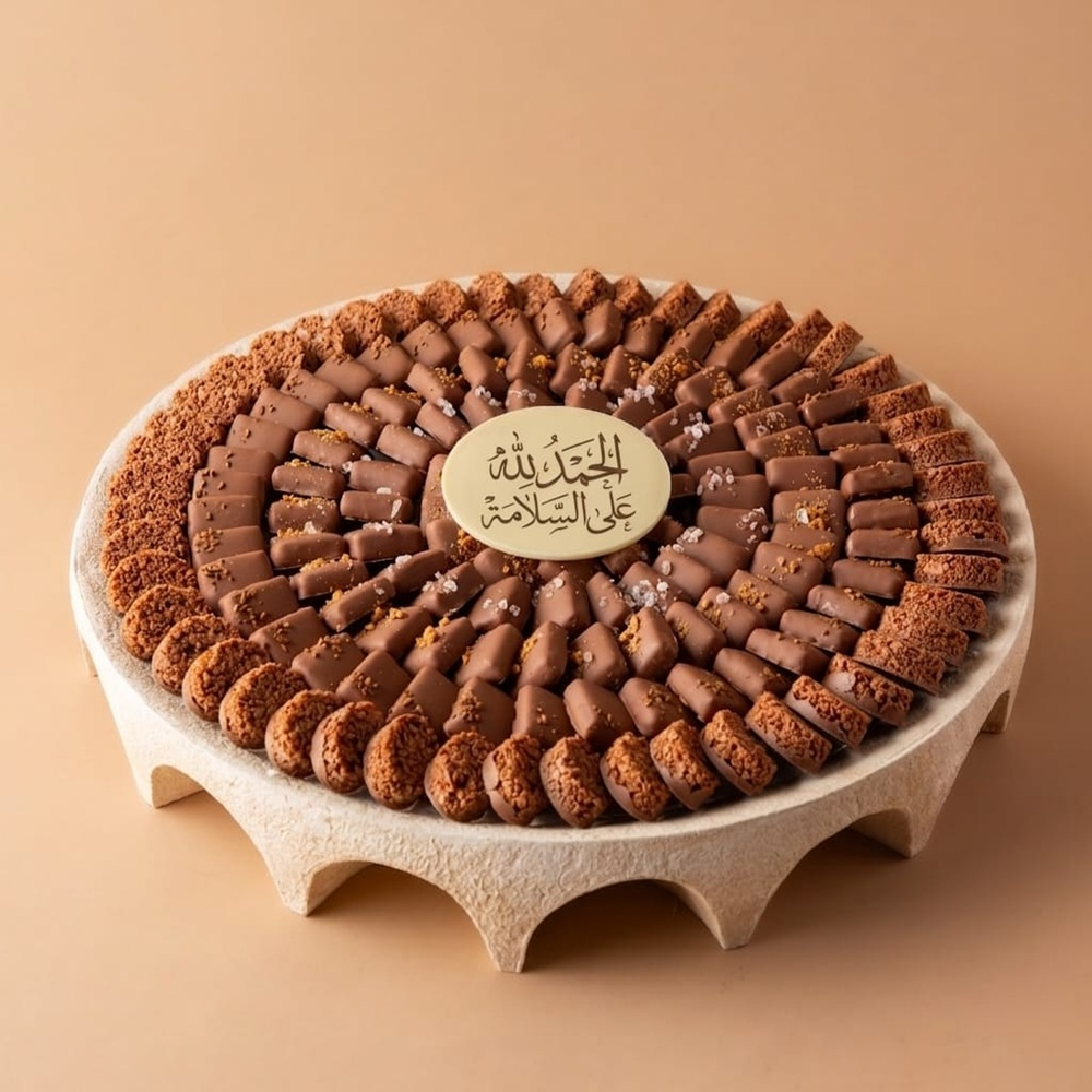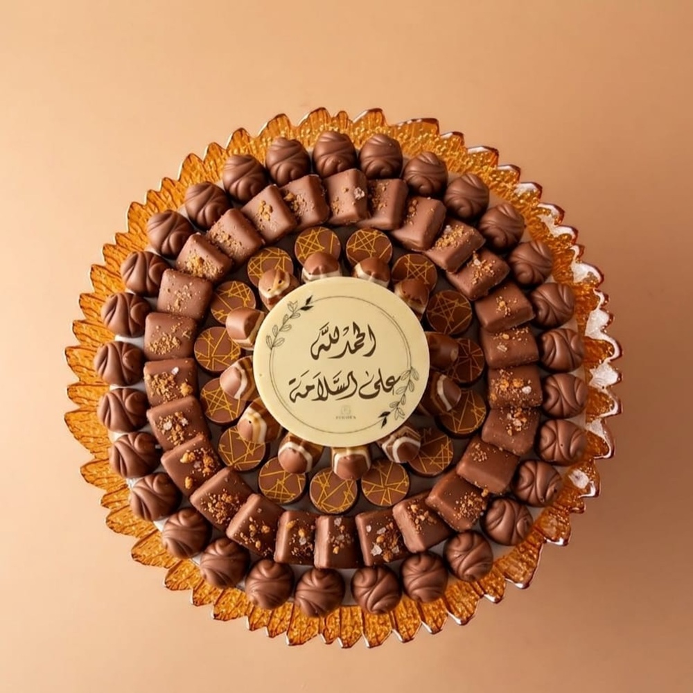 An elegant crystal tray featuring 800g of premium Belgian chocolate with praline wafer, salted lotus, hazelnut, and kinder crunchy fillings with a customized chocolate message.