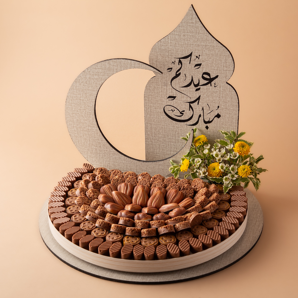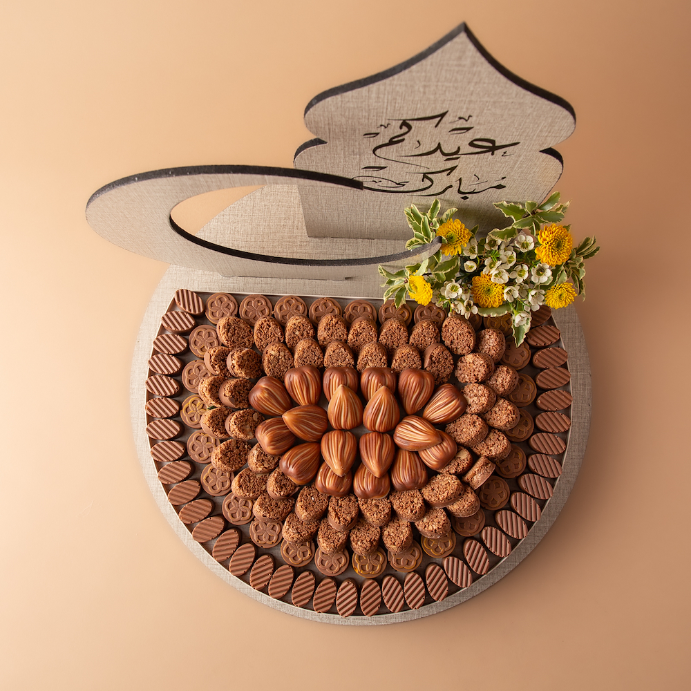 A luxurious wooden tray from our exclusive designs, beautifully decorated with flowers and featuring the phrase “Eid Mubarak” with an elegant crescent shape. It includes a premium selection of Belgian chocolates with assorted fillings such as pistachio, choco crunchy, pecan gianduja, berries, and tropical fruits, offering a refined and delightful Eid gifting experience.