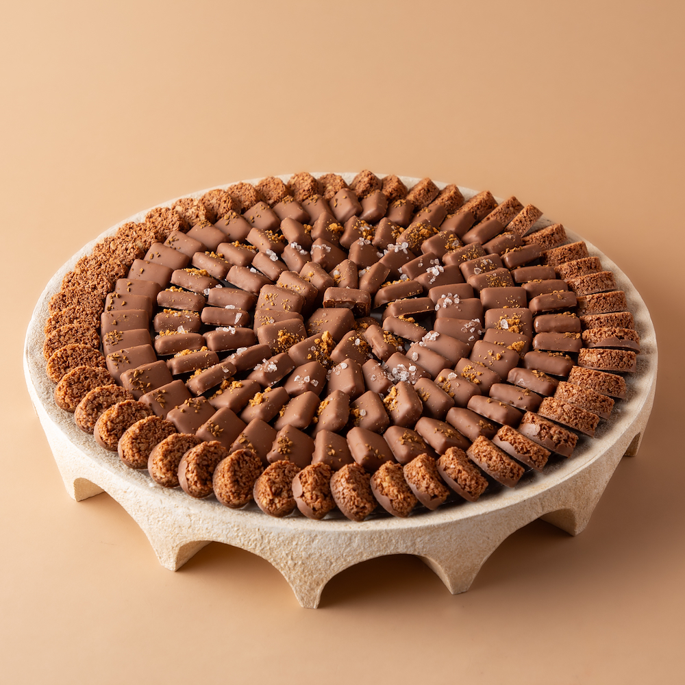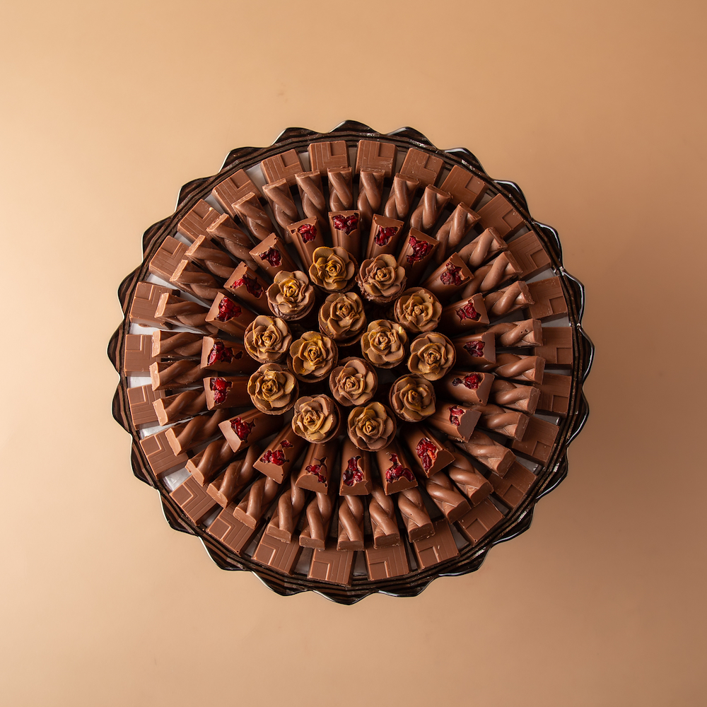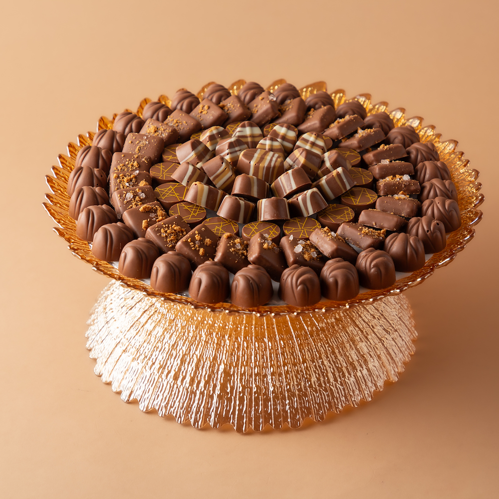 An elegant crystal tray featuring 1.030 kg of premium Belgian chocolate with fillings of hazelnut gianduja, brownie Lotus berry, and Nutella, with a customized chocolate message tailored to the occasion. A perfect choice for luxurious gifting and refined hospitality.