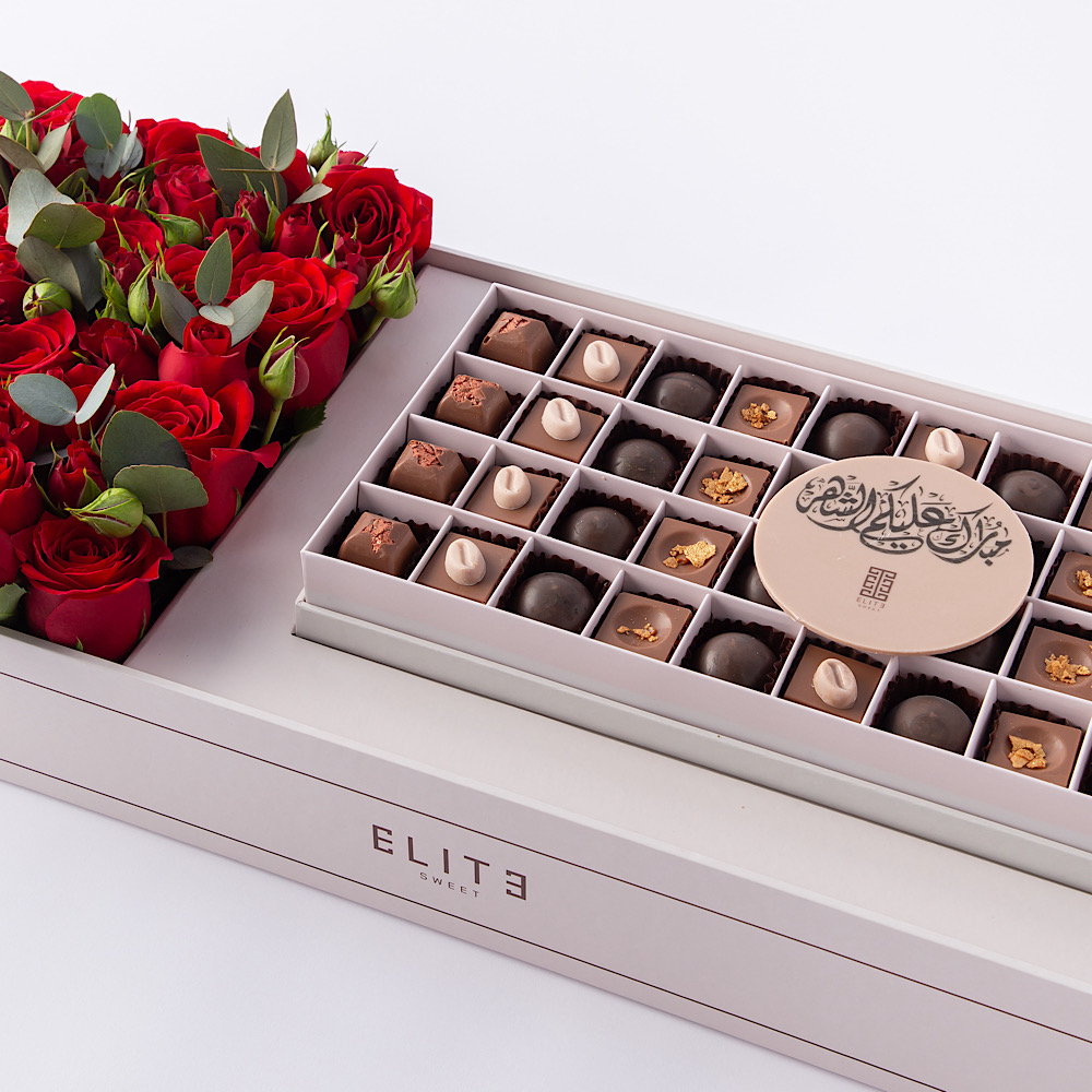 A luxurious Ramadan box containing Belgian chocolates with various fillings accompanied by a beautiful bouquet of natural roses. A perfect gift for the holy month of Ramadan.