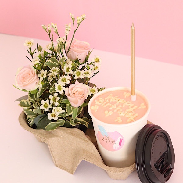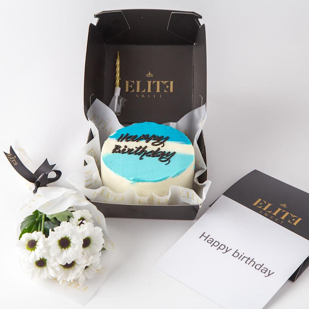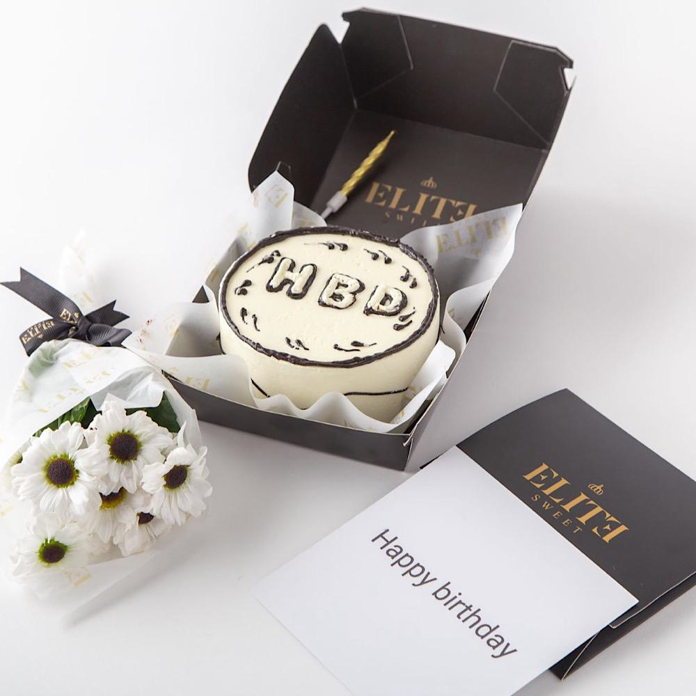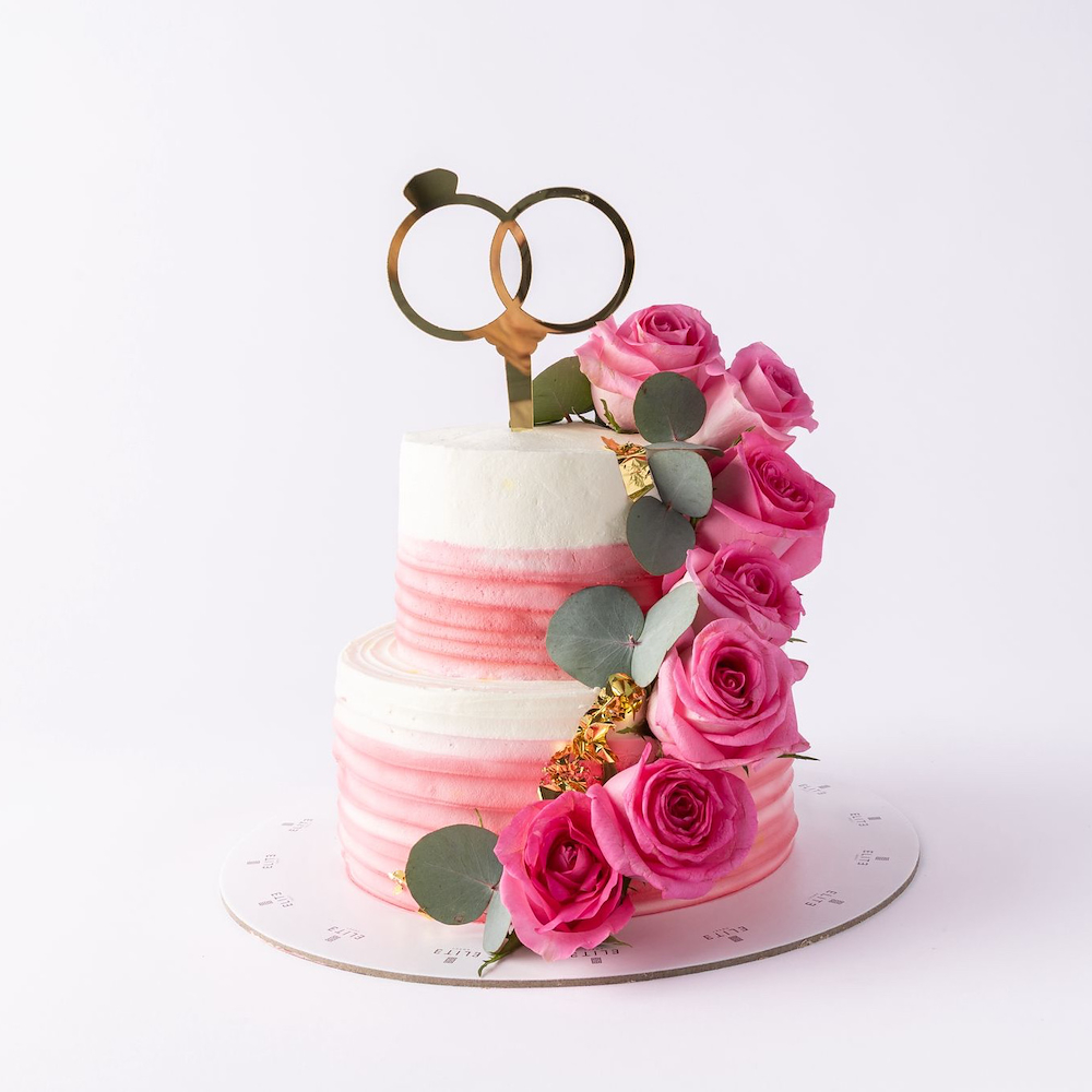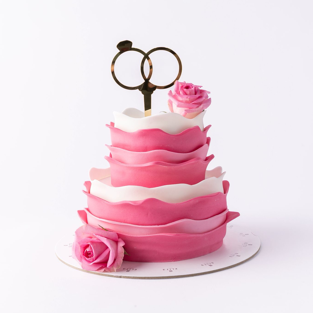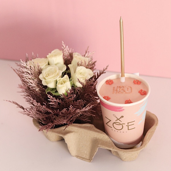 A 4 inches cake, enough for 1 to 2 people in a vanilla, and strawberry flavor with a hand bouquet.