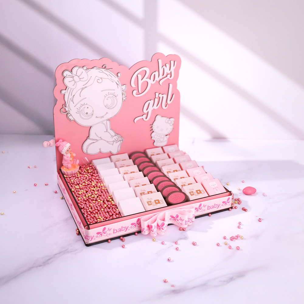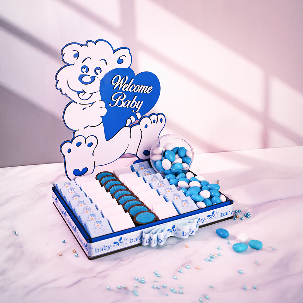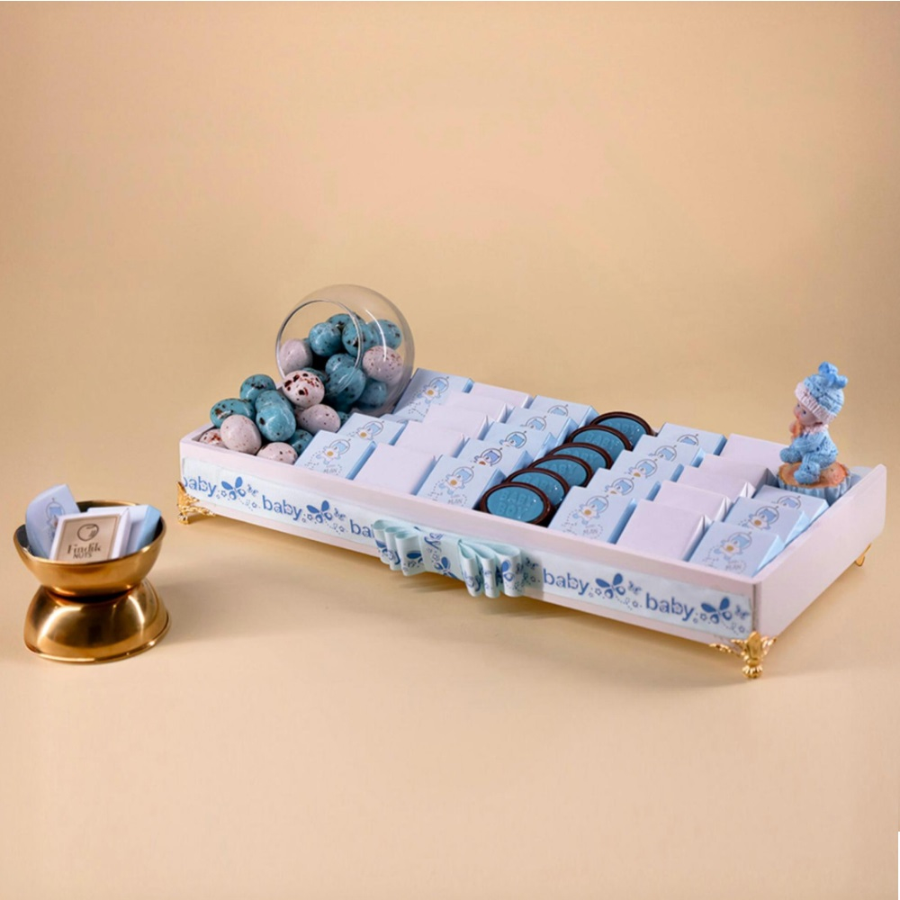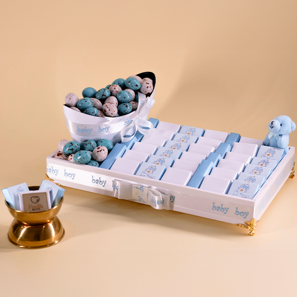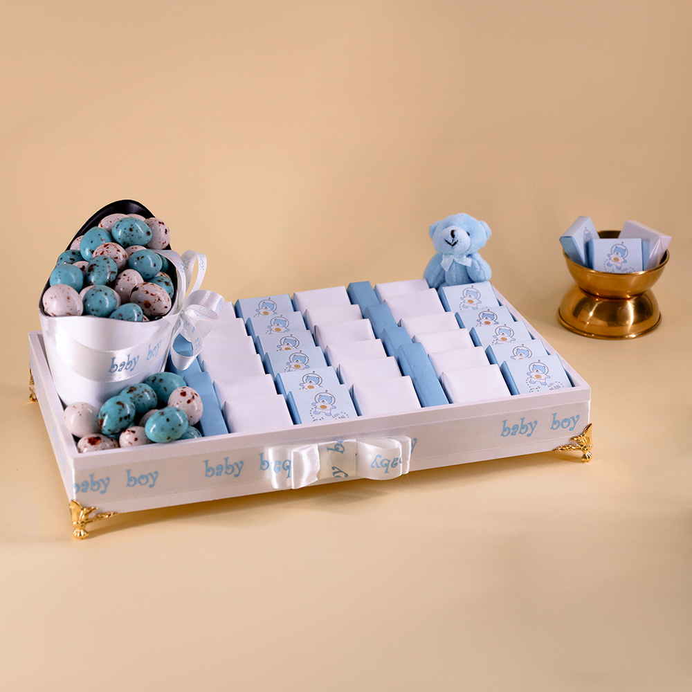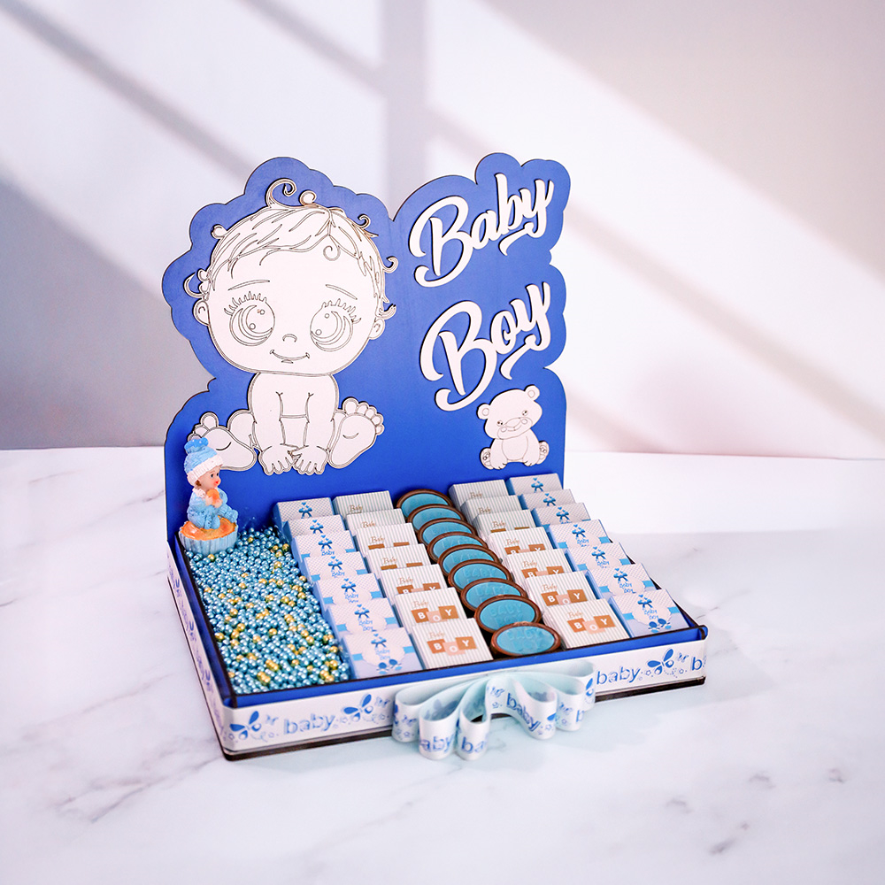 A chocolate tray that contains Square chocolate wafer biscuit Baby boy 220 grams Square chocolate wafer biscuits white 280 grams Chocolate candy blue and white bird’s eggs 480 grams.