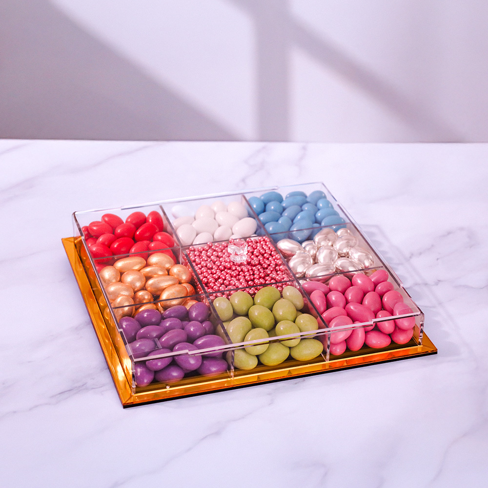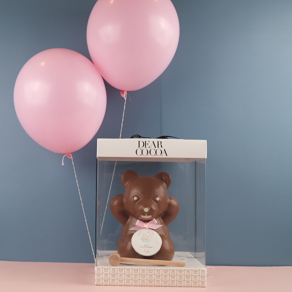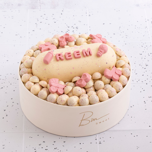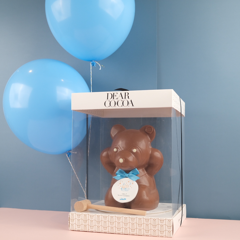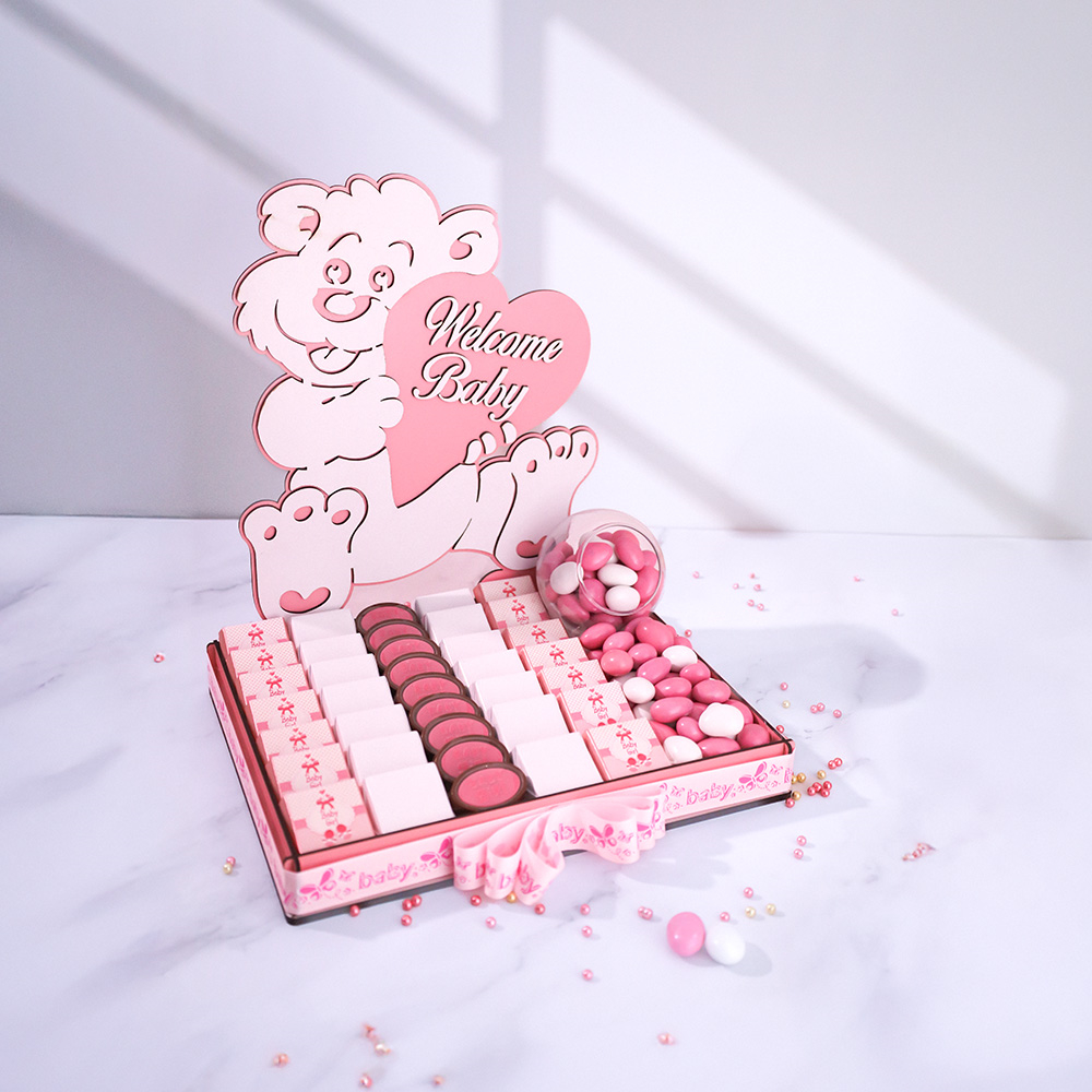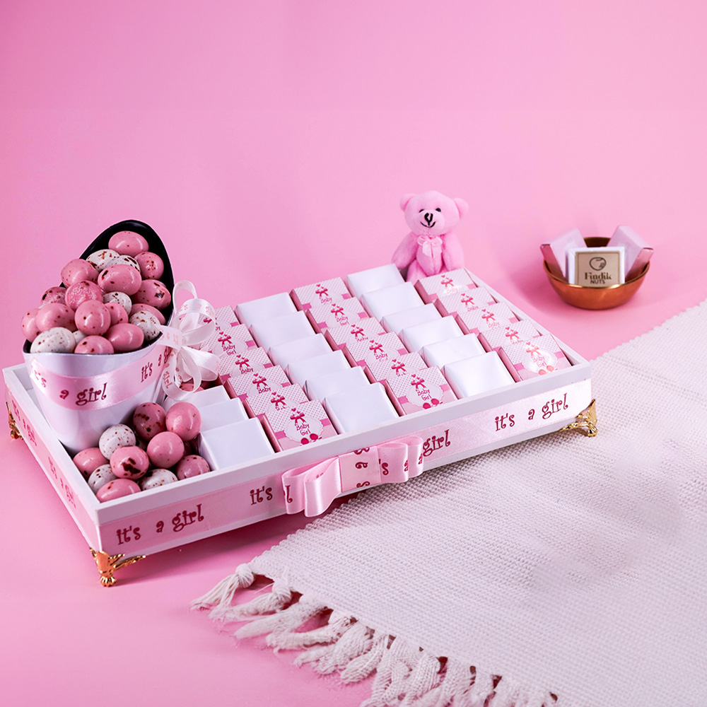 A chocolate tray that contains Square chocolate wafer biscuit Baby boy 220 grams Square chocolate wafer biscuits white 280 grams Chocolate candy blue and white bird’s eggs 480 grams.