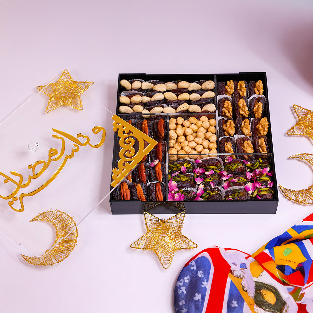 Chocolate tray contains: Square chocolate girl biscuits 340 grams Square chocolate white wafer biscuits 225 grams pink and white bird’s egg chocolate candy 480 grams.
