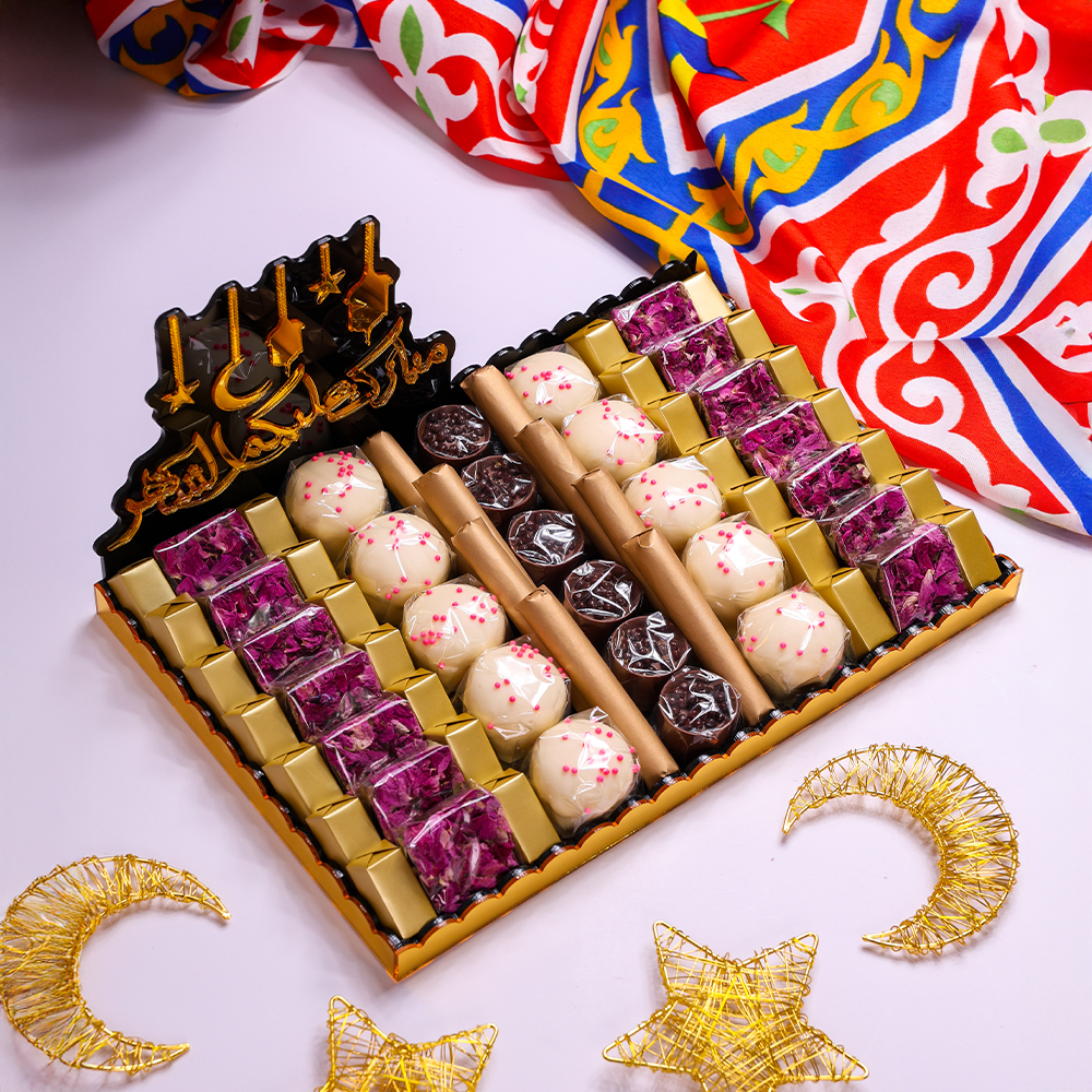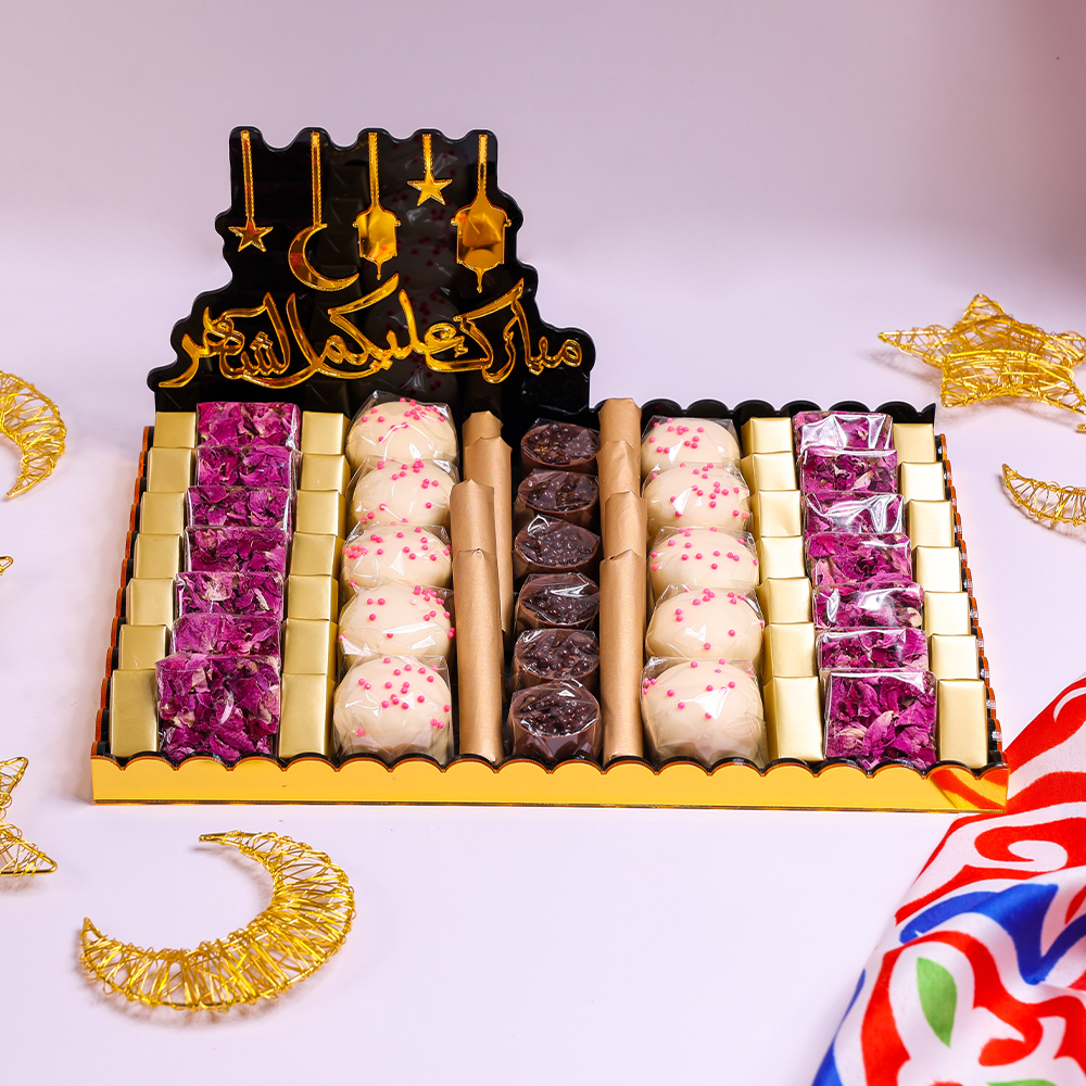 A tray featuring 1.1kg of praline chocolate, square chocolate, red velvet chocolate, and round chocolate.