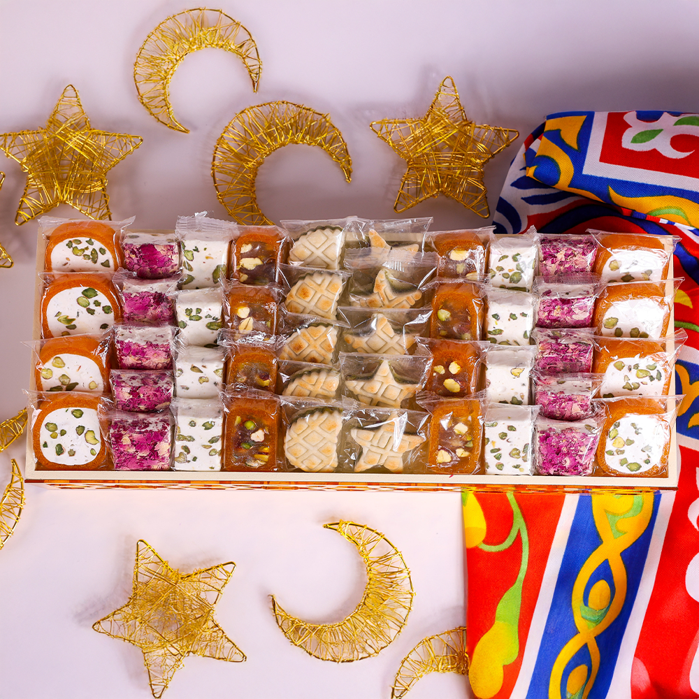 A tray featuring 920g of nougat apricot, pistachio nougat rose, apricot square, pistachio nougat rectangle, crescent mesh marzipan, and star mesh marzipan.