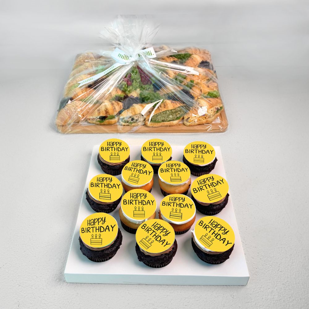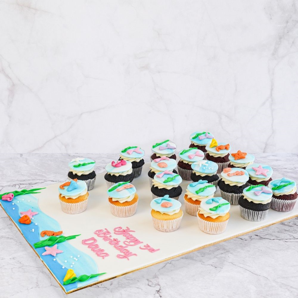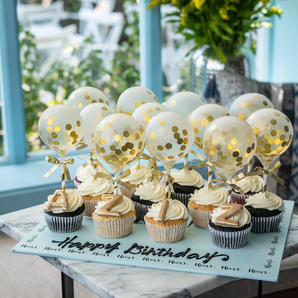 Chocolate, vanilla and red velvet cupcakes topped with balloons.