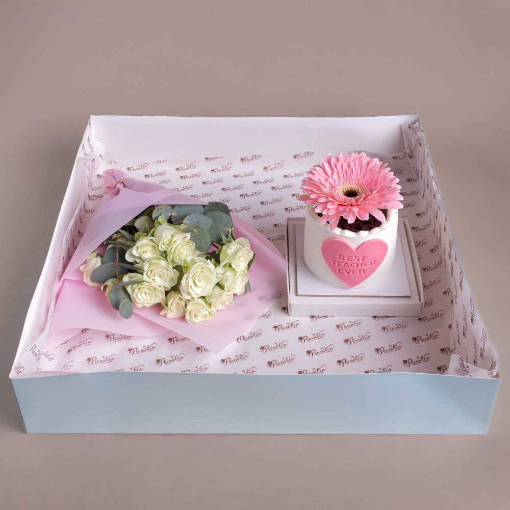 Layers of special vanilla sponge cake and whipped cream, covered with secret raspberry sauce. Comes with a flower bouquet.