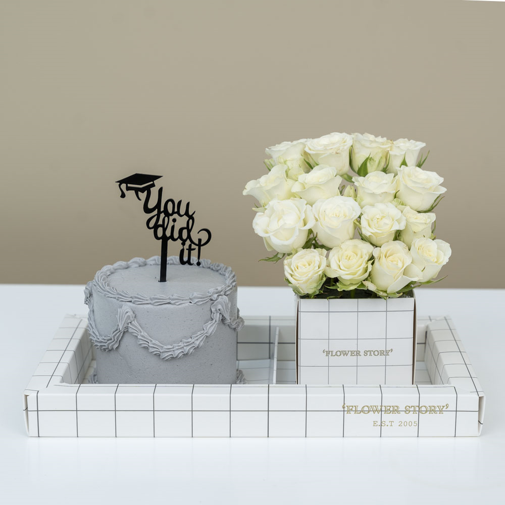 A 4-inch chocolate bento cake with baby roses. The flavor can be changed to red velvet or vanilla.